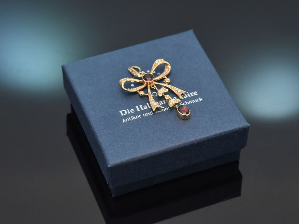 Charming vintage bow pendant with garnet and seed pearls, crafted from 333/8 carat yellow gold (stamped and guaranteed).