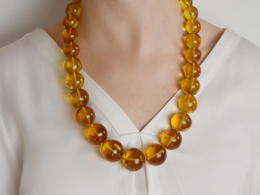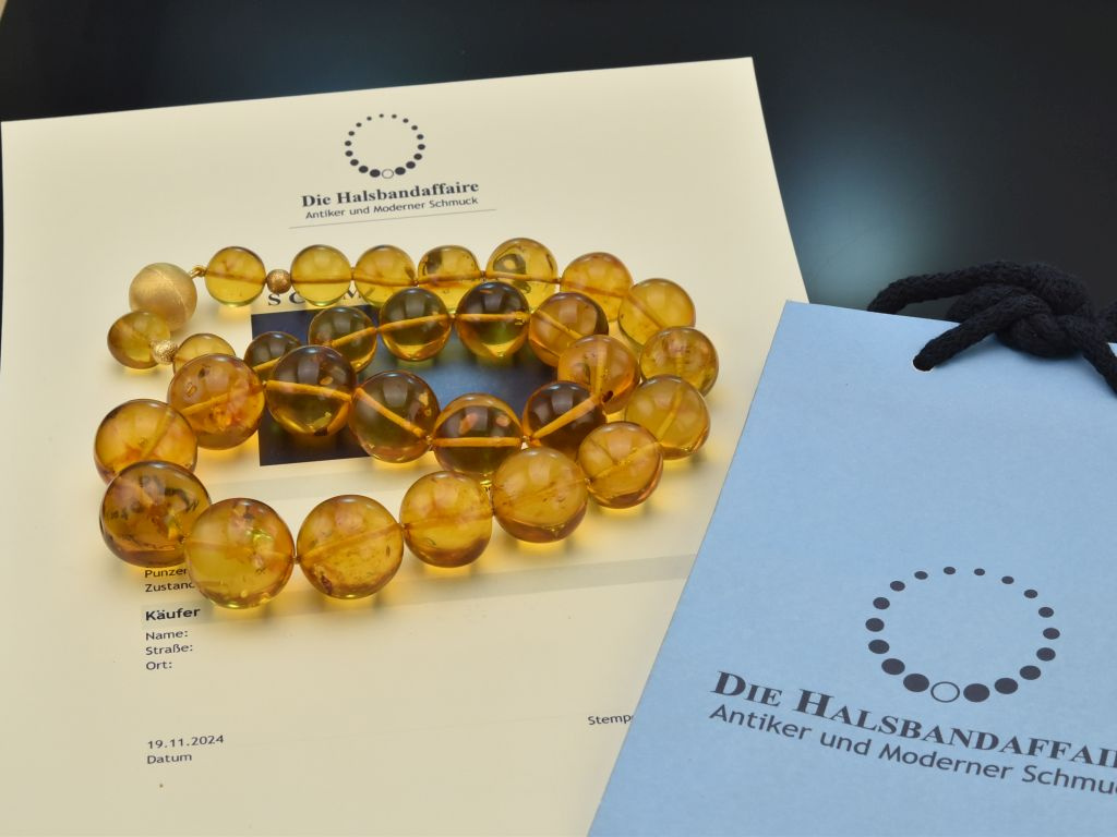 This impressive necklace consists of beautiful, polished amber balls of remarkable size. Baltic amber is particularly impressive due to its interesting, lively inclusions, known as sunflints, which create particularly beautiful light reflections.