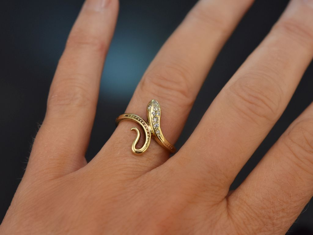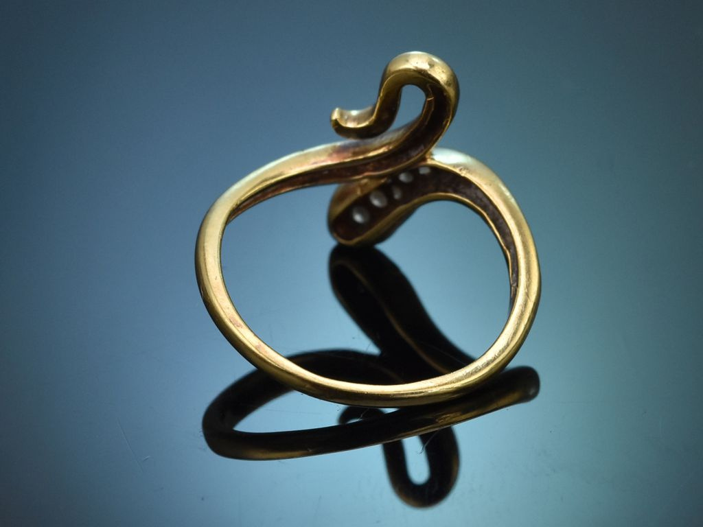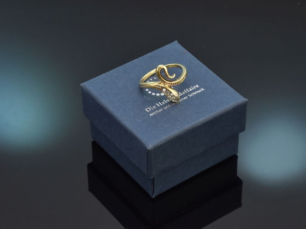 The elegant ring is crafted in the shape of a coiling snake. The head of the snake is set with seven sparkling diamonds, while two further diamonds serve as the snake's eyes. The sparkling diamonds total ca. 0.12 ct and are in the beautiful quality range (H, SI1-SI2). The back of the snake has a fine, hammered pattern reminiscent of the typical scales of reptiles.