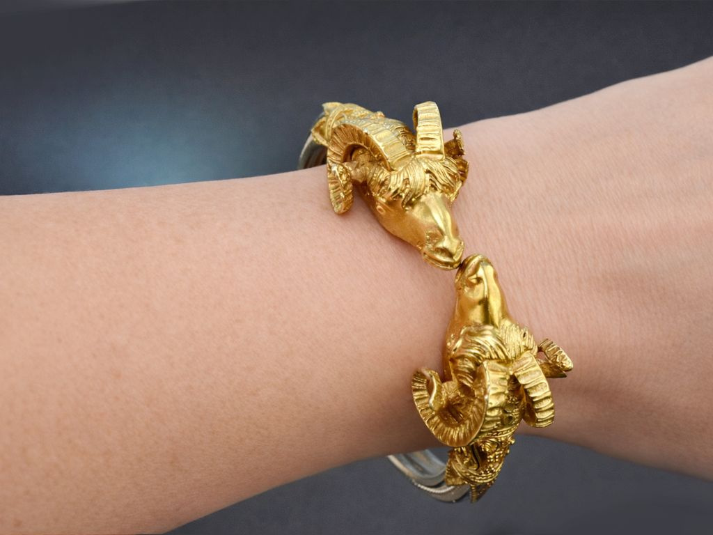 Opposite the ram’s heads, the bangle features a similarly gold-plated and ornately decorated clasp, allowing it to be opened and easily slipped over the wrist.