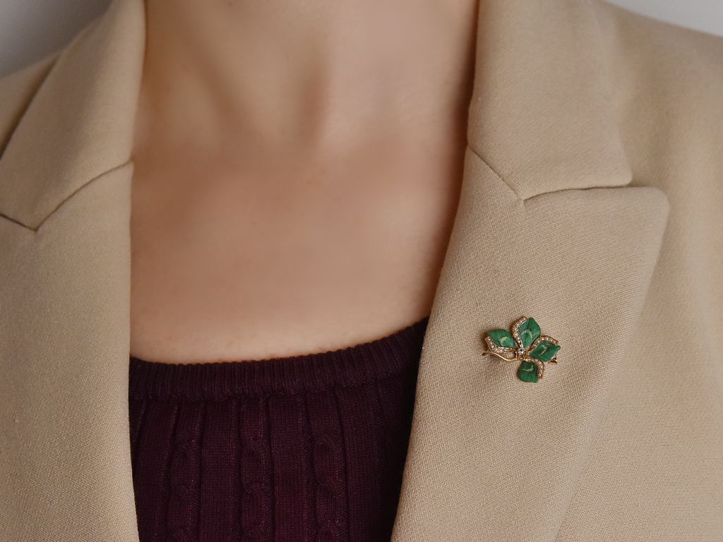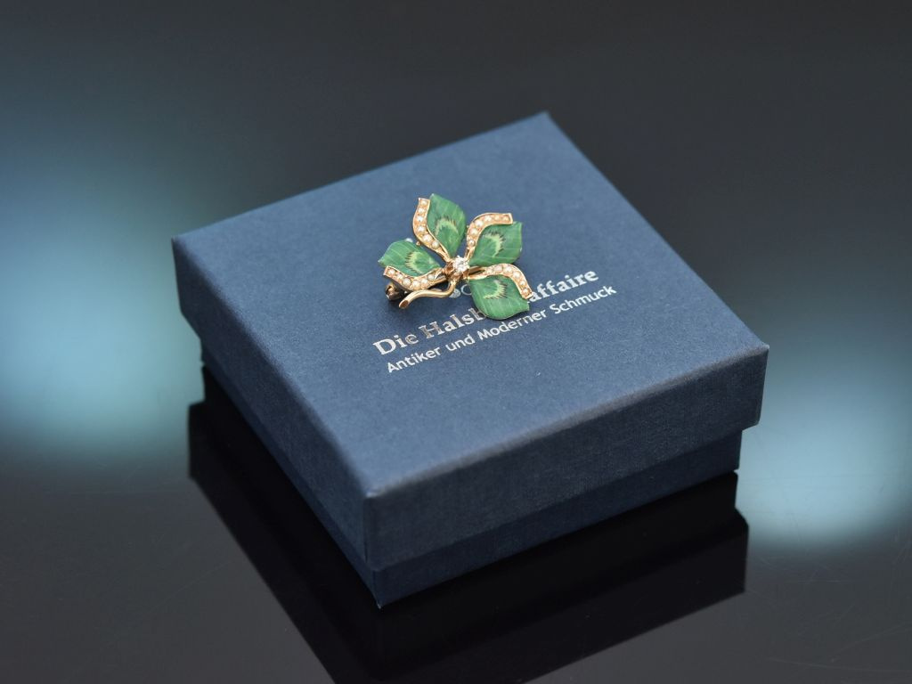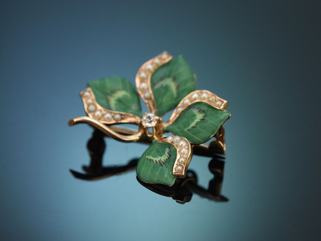 The four leaves of the clover are intricately detailed in enamel. Each individual leaf is edged on one side by a golden band set with six seed pearls. In the centre of the cloverleaf sits an old-european-cut diamond of ca. 0.04 carats (H–I, SI1). A golden stem harmoniously complements the sweeping design.