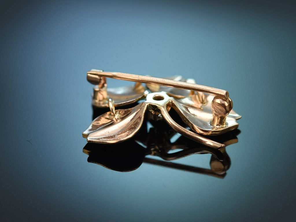 Pretty historical cloverleaf brooch with diamond and seed pearls, crafted from 585/14 carat yellow gold (tested and guaranteed).