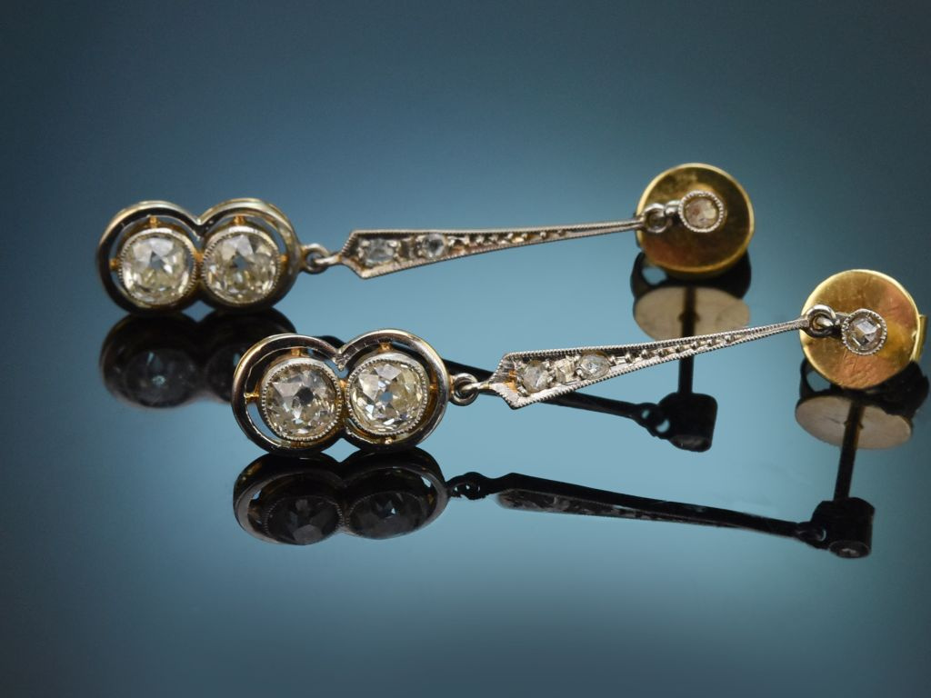 These highly elegant earrings each consist of narrow bars set with two rose-cut diamonds, which are connected to a rounded decorative element via a movable eyelet. These freely swinging decorative elements are set with a total of four large and beautifully sparkling old-european-cut diamonds weighing ca. 1.2 carats (I-J, SI1-P1). The diamonds are set in secure bezel settings, accentuated by millegrain and enclosed by a polished frame.