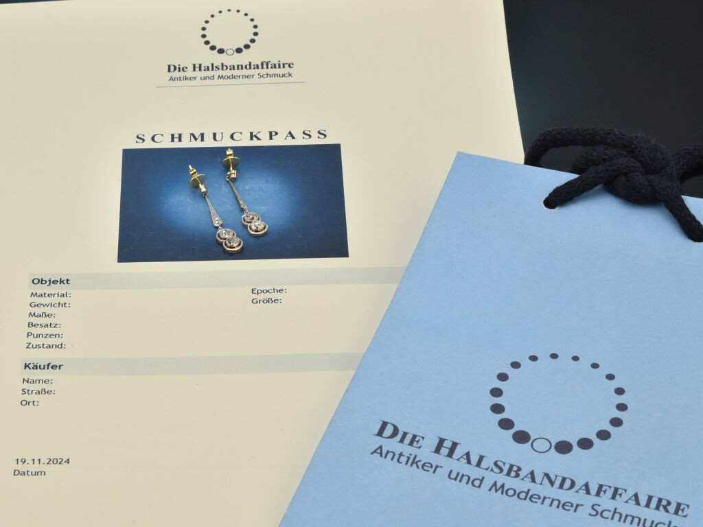 The delicate antique earrings were created around 1915 and are a beautiful example of early Art Déco jewellery. With their understated yet glamorous design, they remain sought-after and cherished accessories to this day, complementing both classic everyday outfits and chic evening wear.