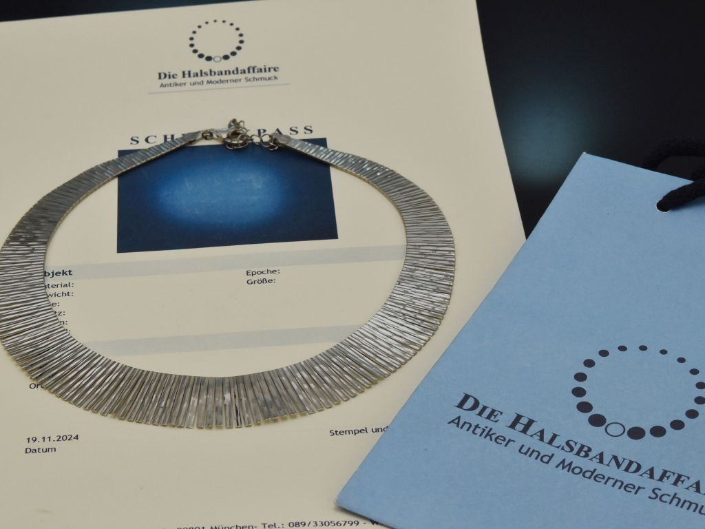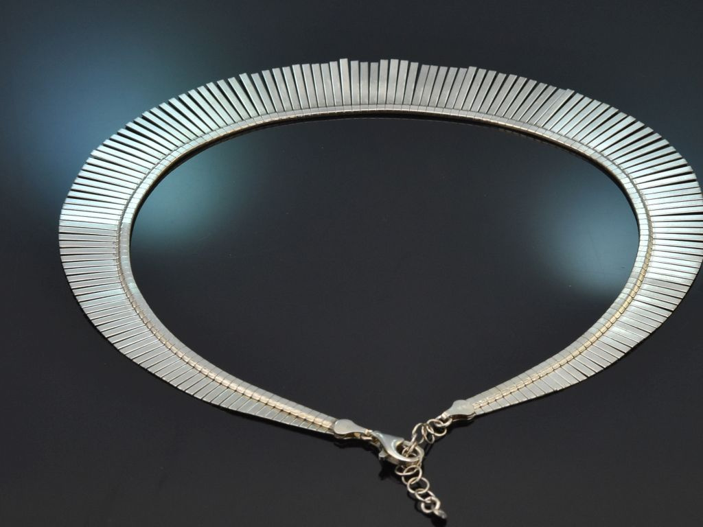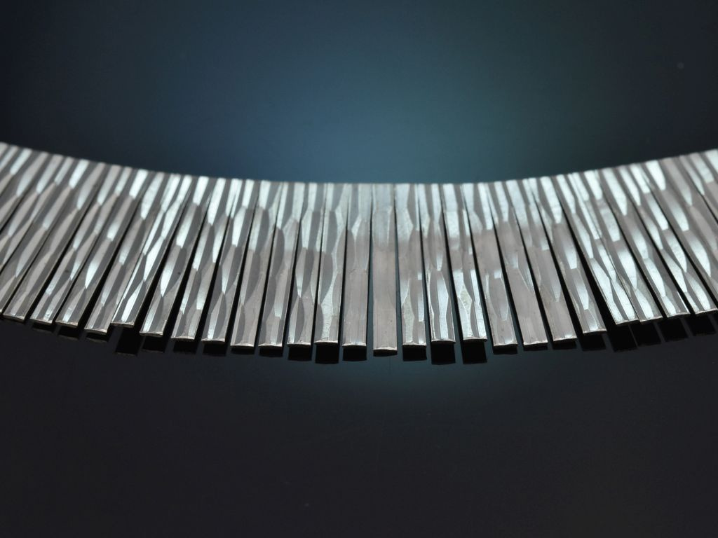 The chic necklace consists of fine, ray-like links, which are arranged in a movable pattern. A hammered structure creates lively light reflections on the rays, which provide additional sparkle.