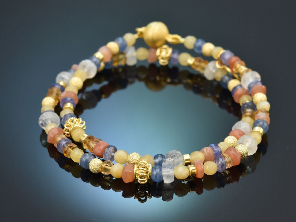 The handmade bracelet can be worn as a double strand and consists of faceted and polished beads made of kyanite, tanzanite, moonstone, citrine and calcite. The chic colour combination of warm and cool shades is beautifully complemented by elements of gold-plated silver.