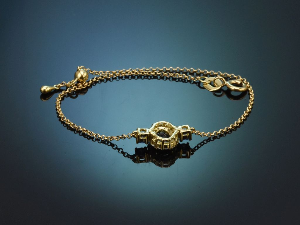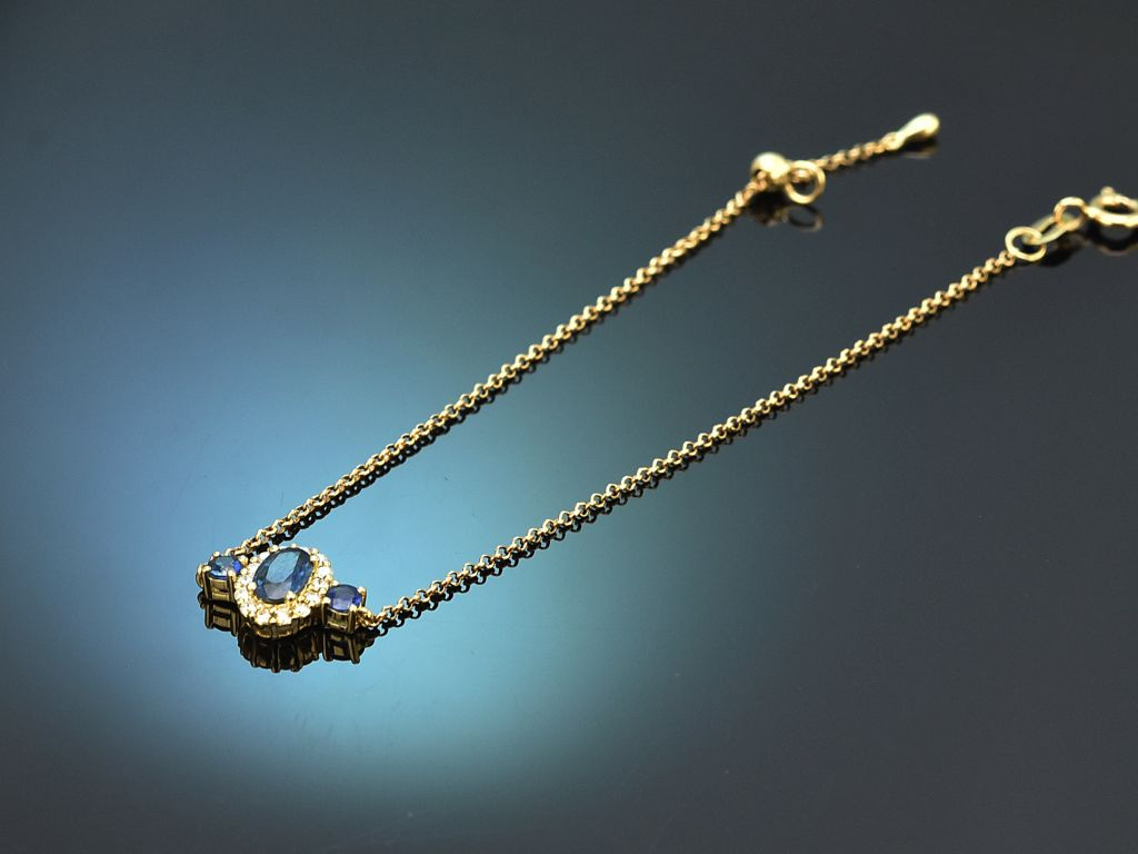 The fine bracelet consists of a centrepiece with a royal blue, oval faceted sapphire framed by a ring of sparkling brilliant-cut diamonds. To the side, two round faceted sapphires create a beautiful accent. The luminous blue gemstones together weigh 0.6 carats, the fourteen diamonds have a combined stone weight of 0.15 carats and are in the beautiful quality range (H-I, VS2-SI1).