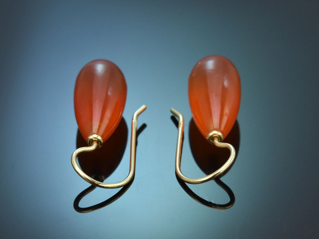 Simple yellow gold hook clasps each feature a beautiful drop of polished carnelian in bright orange. The beautiful, cheerful colour harmonises perfectly with the warm golden sheen of the practical hooks.