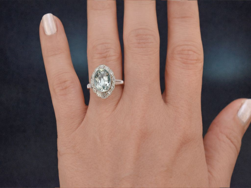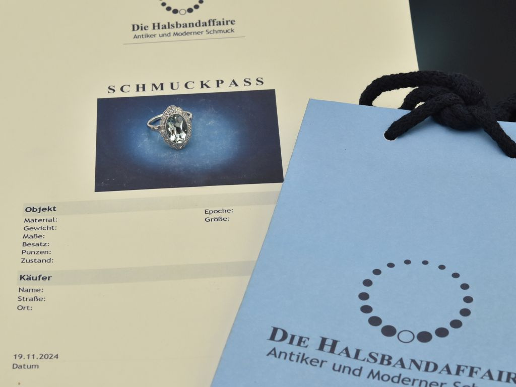 The large, pointed oval ring head is set with a beautiful oval-cut aquamarine weighing 3.65 carats, which captivates with its characteristic, delicate blue colour. The precious stone is surrounded by a total of 14 octagonal diamonds, which in turn are set within a delicate millegriffe ornament.