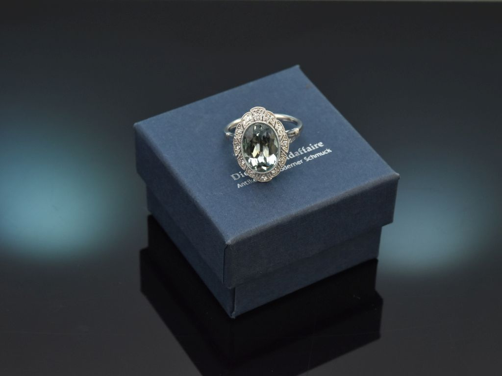 A stunning aquamarine ring with diamonds, crafted from 750 white gold / 18 carat (hallmarked and guaranteed).