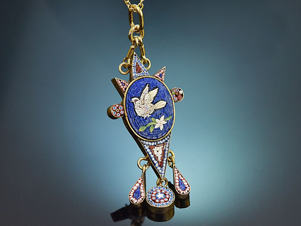 This finely crafted Italian pendant is set with an intricate micro-mosaic made up of countless tiny glass stones. In the centre, a delicate white dove appears against a blue background, enclosed in an elegant oval frame. The upper part of the pendant is adorned with three square and two round decorative elements, whose decorative patterns attractively frame the composition. Below the dove is a triangular decorative element to which further movable micro-mosaic pendants are attached.