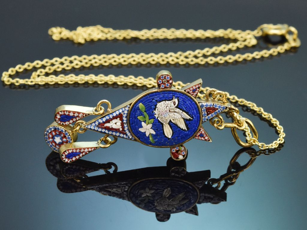 Rare antique micro-mosaic pendant with chain, crafted from gold-plated silver and 333/8 carat yellow gold (stamped, tested and guaranteed).