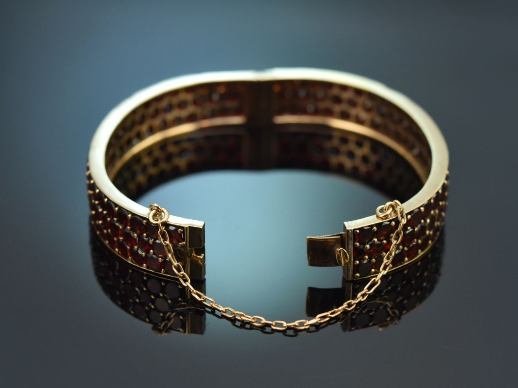 The elegant bangle is set with three rows of deep red, vividly sparkling table-cut garnets. The warm play of colours in the stones gives the piece a special aura and emphasises its traditional character. A carefully crafted box clasp with an additional safety chain ensures secure and comfortable wear.