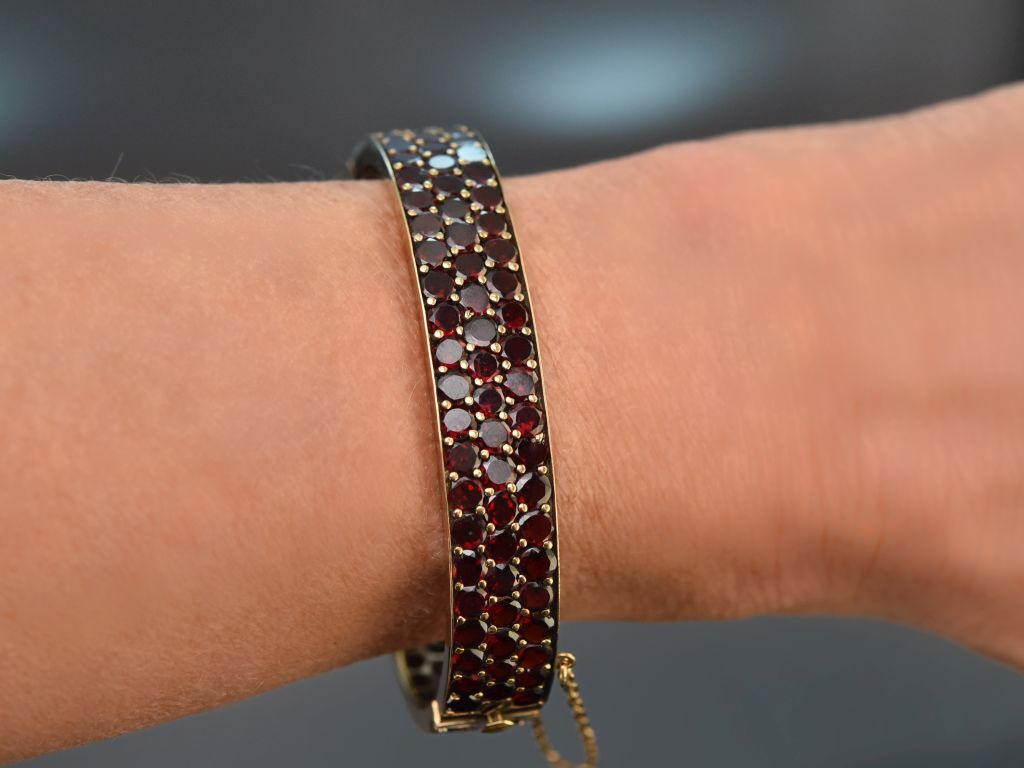 Classic historical garnet bangle from Linz, made of gold-plated tombac (tested and guaranteed).