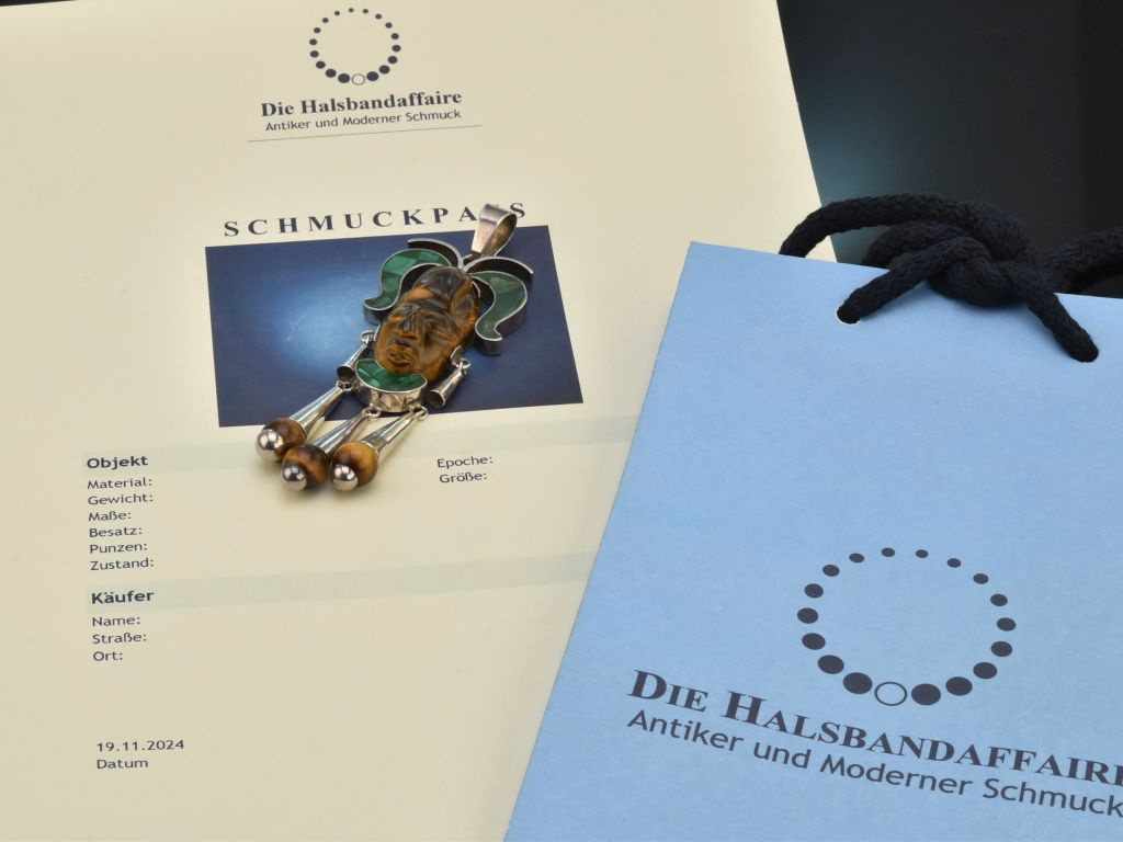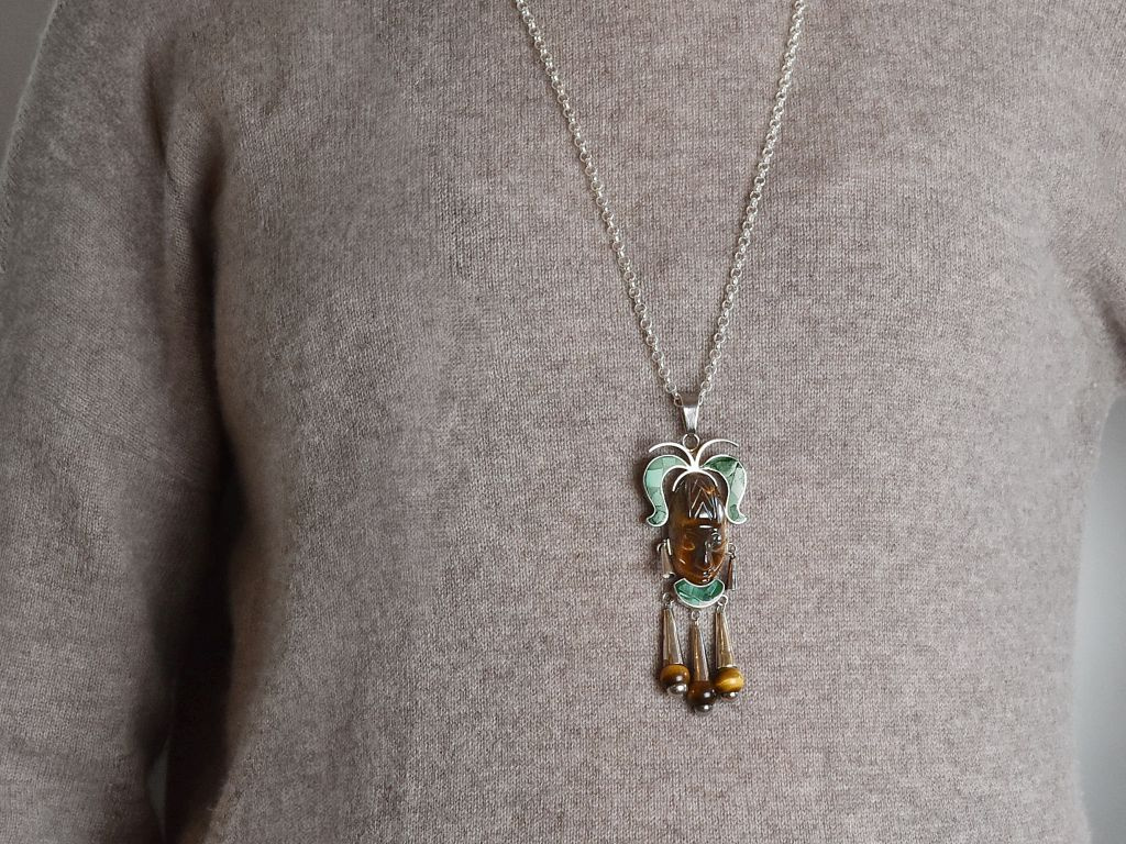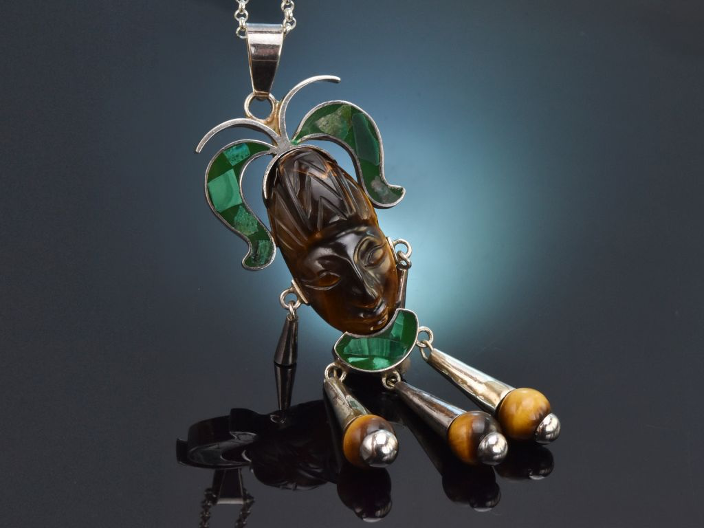 The striking vintage pendant from the sixties depicts a Mayan mask with the typical facial features and traditional decoration. The mask is made from a beautiful golden-brown iridescent tiger's eye. Its typical headdress consists of malachite inlays, as does the abstract collar. Two conical silver pendants serve as ear jewellery for the anthropomorphic motif. The lower end of the pendant is also adorned with three large pendants, the ends of which are decorated with tiger's eye spheres.