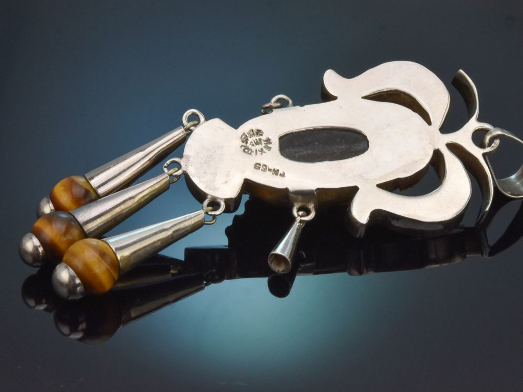 The large pendant was created in Mexico around 1965 and combines the contemporary taste of the Sixties with the traditional design language of Mayan culture and Mexico's pre-Columbian past. The combination of tradition and modernity is typical of many of these Mexican designs and makes this jewellery unique and special.