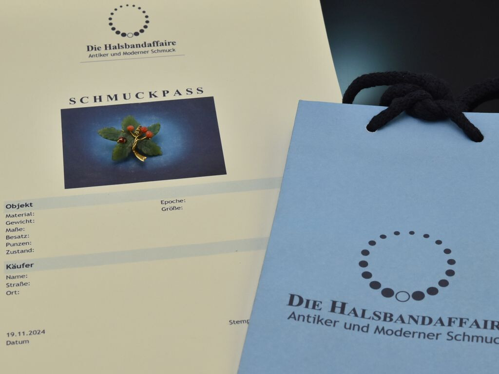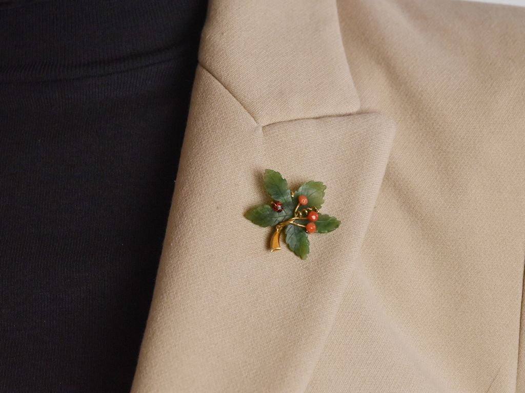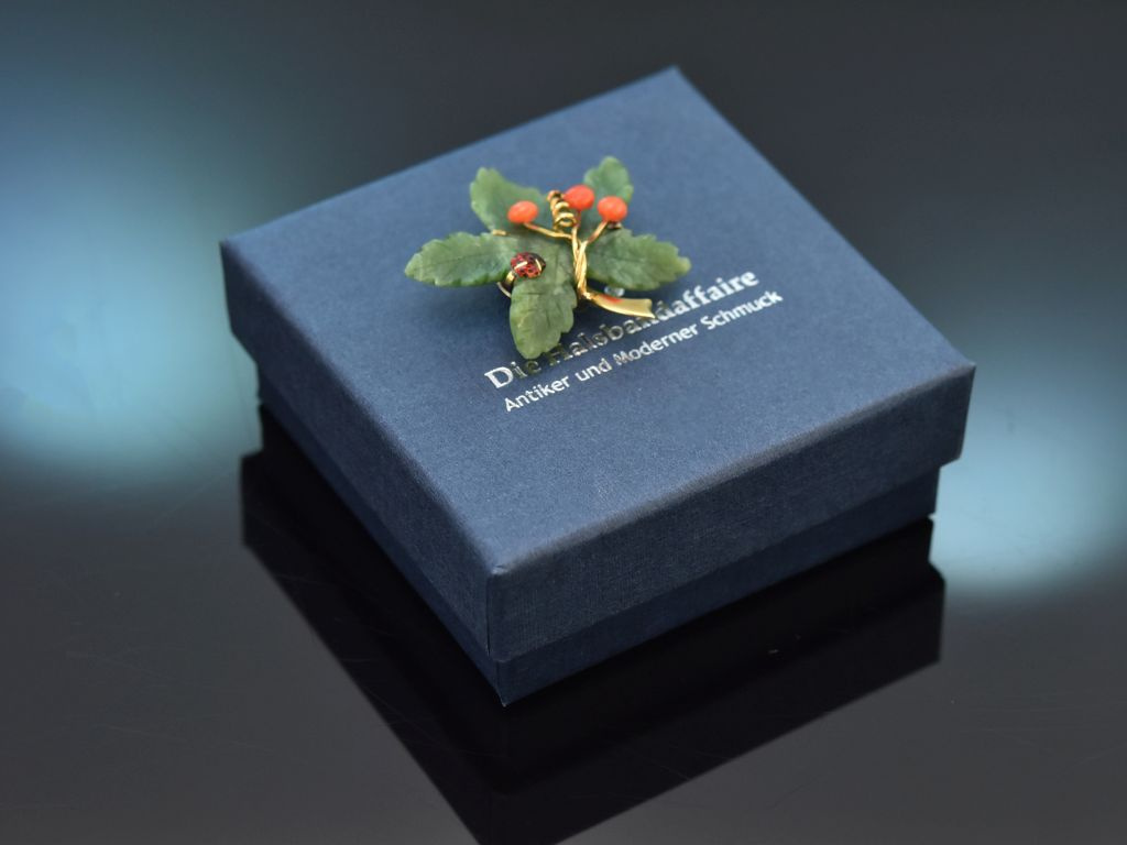 The brooch, typical of the period, consists of a naturalistically engraved jadeite leaf with a golden stem, to which three red coral beads in the shape of stylised berries are attached on fine gold wires. Between the corals is a spiral-shaped wire that could represent the typical shoots of a vine. Particularly enchanting, however, is a small, sculpted, red enamelled ladybird, which is also located on the leaf and gives the piece of jewellery a charming, lively accent.