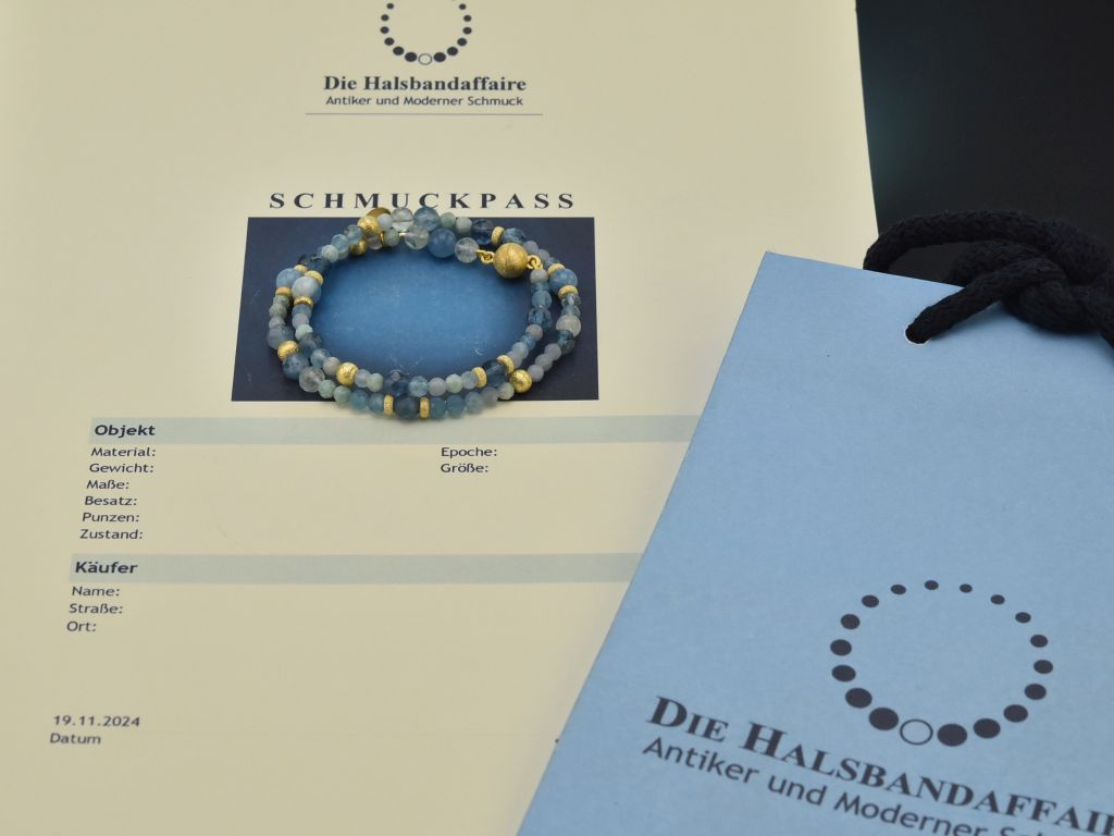 The bracelet is worn as a double strand and consists of faceted and polished beads of sapphire, aquamarine, amazonite and angelite in delicately coordinated soft blue tones. Pretty decorative elements in gold-plated silver add delicate highlights throughout. A round magnetic clasp, also in 925 gold-plated silver, allows for practical and secure fastening and unfastening.