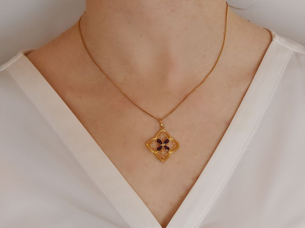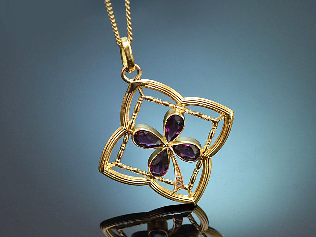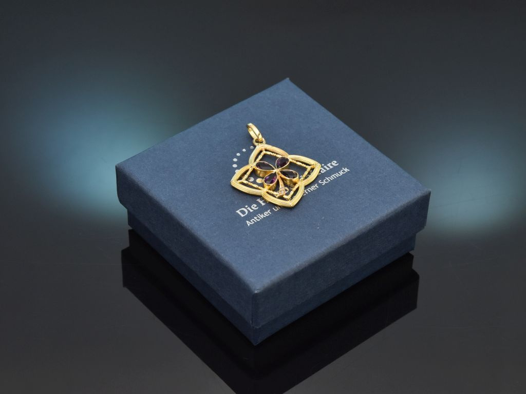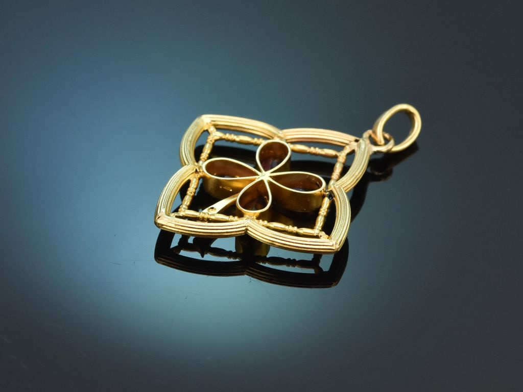 The fine pendant is crafted in an openwork, tapered quatrefoil motif with fine engravings and delicate bars. At its centre is a flower made of four drop-shaped faceted almandines in a beautiful violet tone. The almandines belong to the gemstone group of garnets and have a combined stone weight of ca. 1.2 carats.