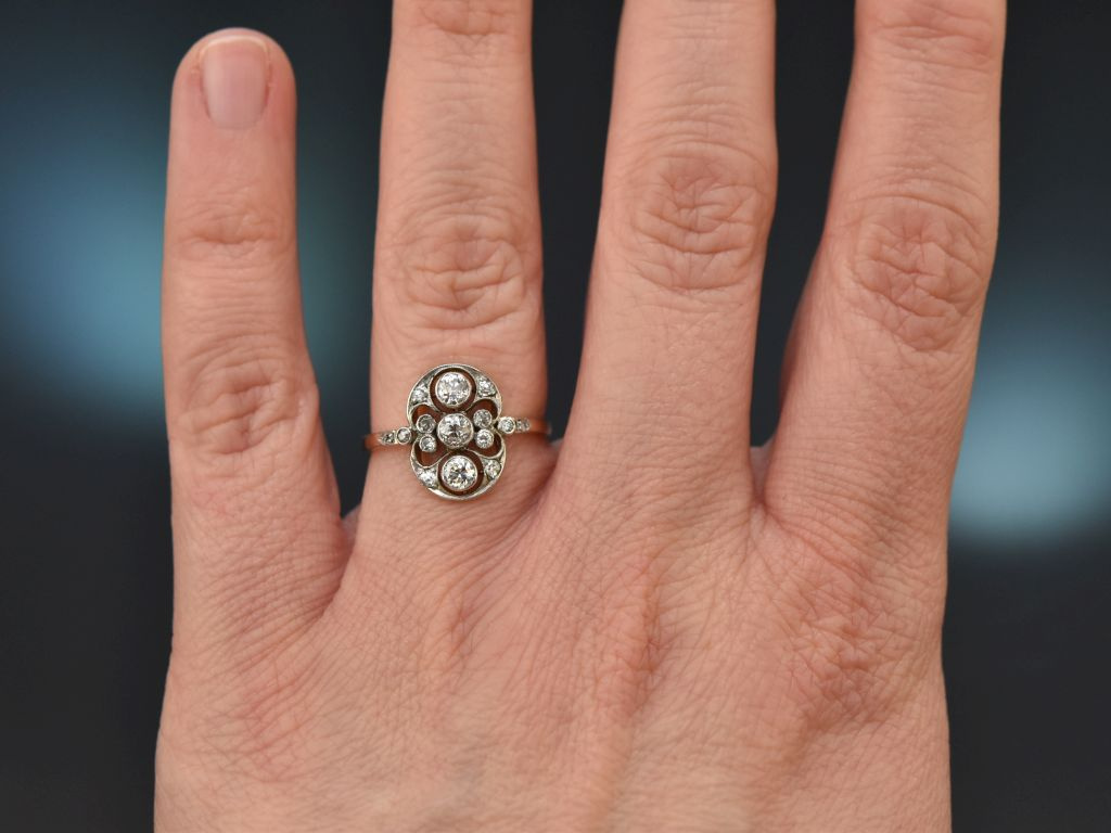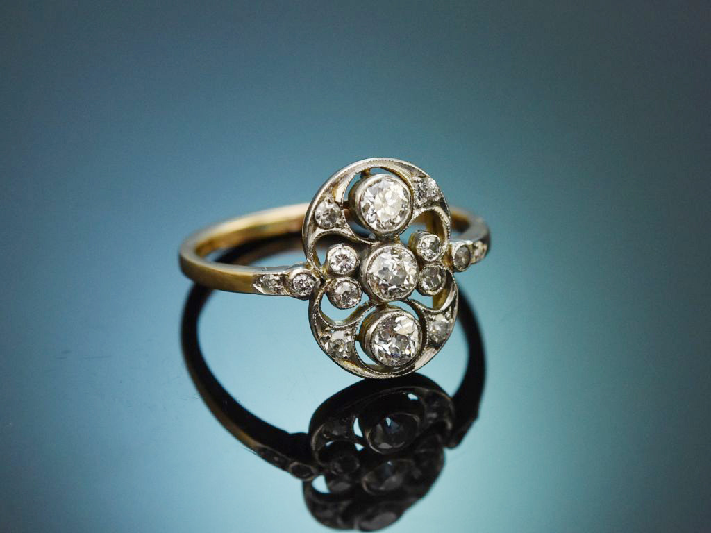 The shield-shaped ring head is openwork and set with a row of three old-european-cut diamonds in the centre. Embedded in gently curved décor, the three main stones are accompanied by twelve additional old-european-cut diamonds, four of which are set on the delicate ring shoulders.
