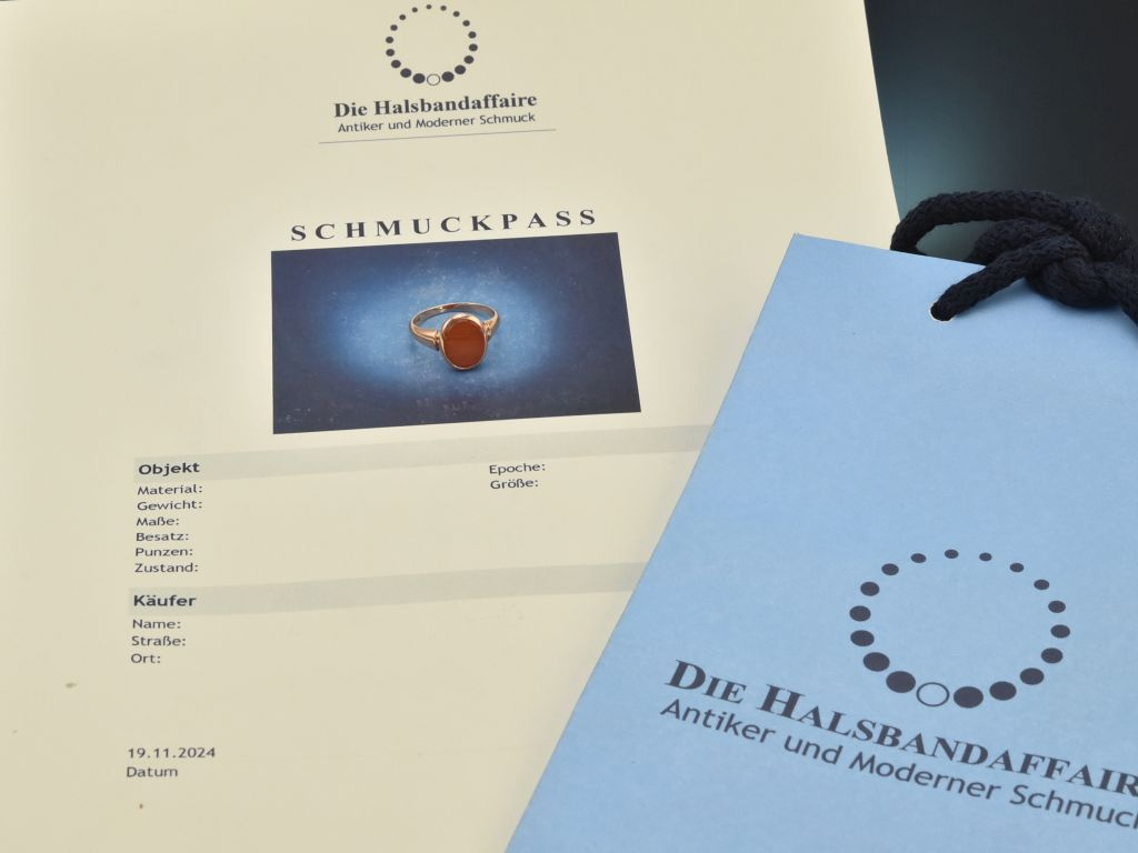 This delicate ring, featuring an oval ring head, is set with a beautiful orange-brown carnelian in a table cut. The ring shoulders add a particularly beautiful touch; they are not directly connected to the ring head but are separated from it by a narrow golden bridge.