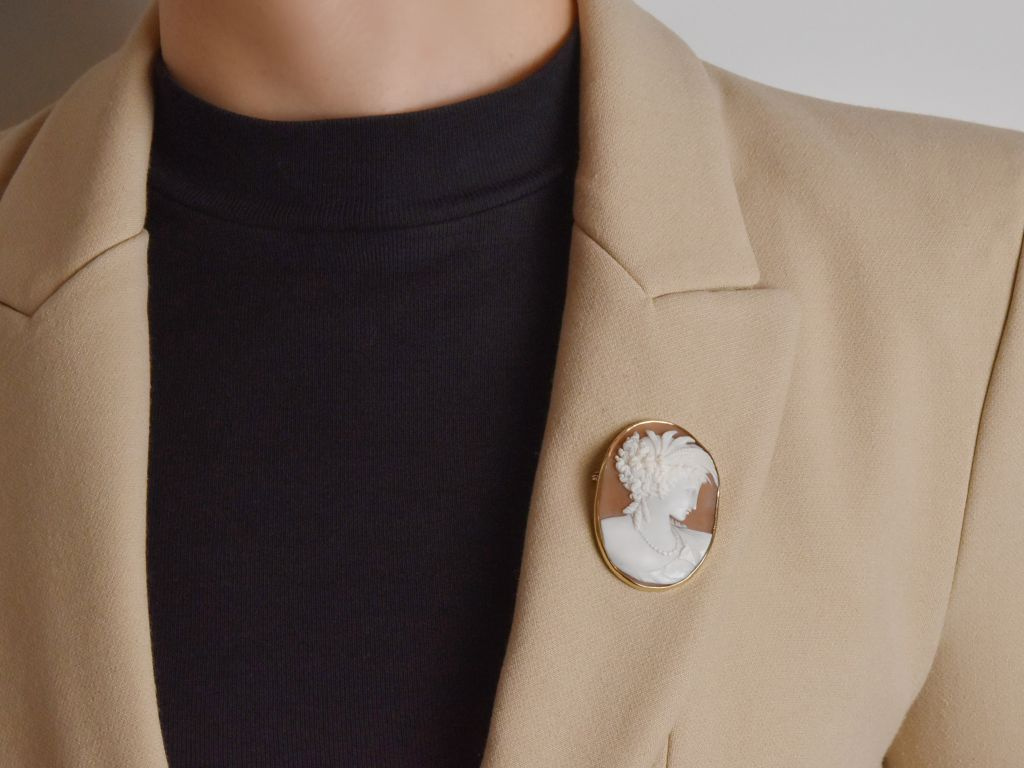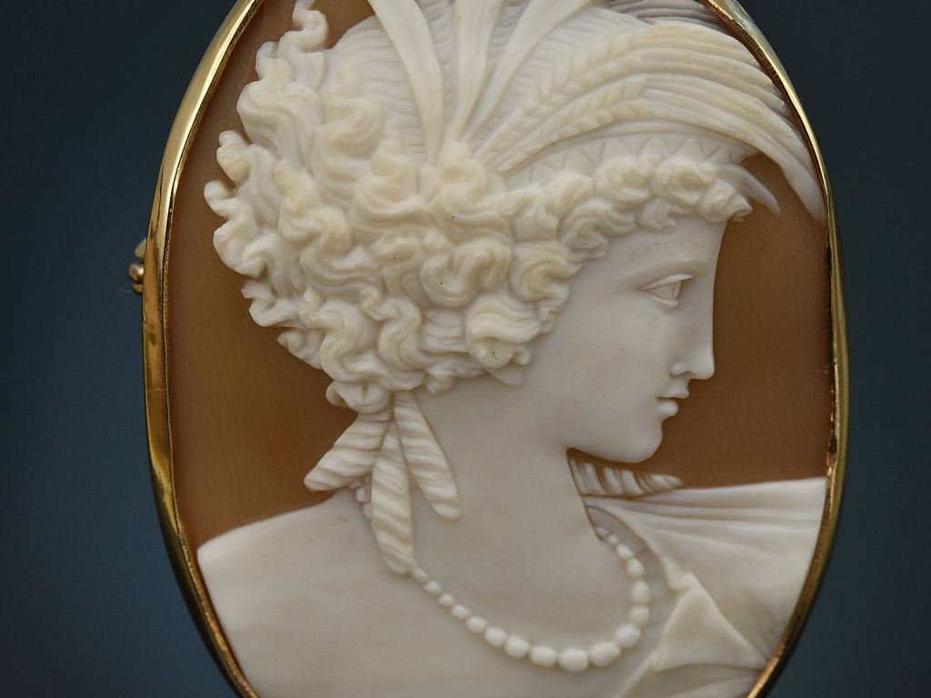 Die englische Brosche ist mit einer fein geschnittenen, ovalen Muschelkamee besetzt, welche das antikisierende Bildnis der Göttin Ceres im Profil nach rechts zeigt. Die römische Göttin des Ackerbaus und der Fruchtbarkeit wird immer mit ihren ikonographischen Attributen wie Früchten, Fackel, Schlange, Ährenkranz oder Ährengarbe dargestellt. Auf der vorliegenden Brosche trägt sie einen Strauß aus Kornähren im Haar. Die Kamee ist fein geschnitten und beeindruckt durch den Detailreichtum der Darstellung.