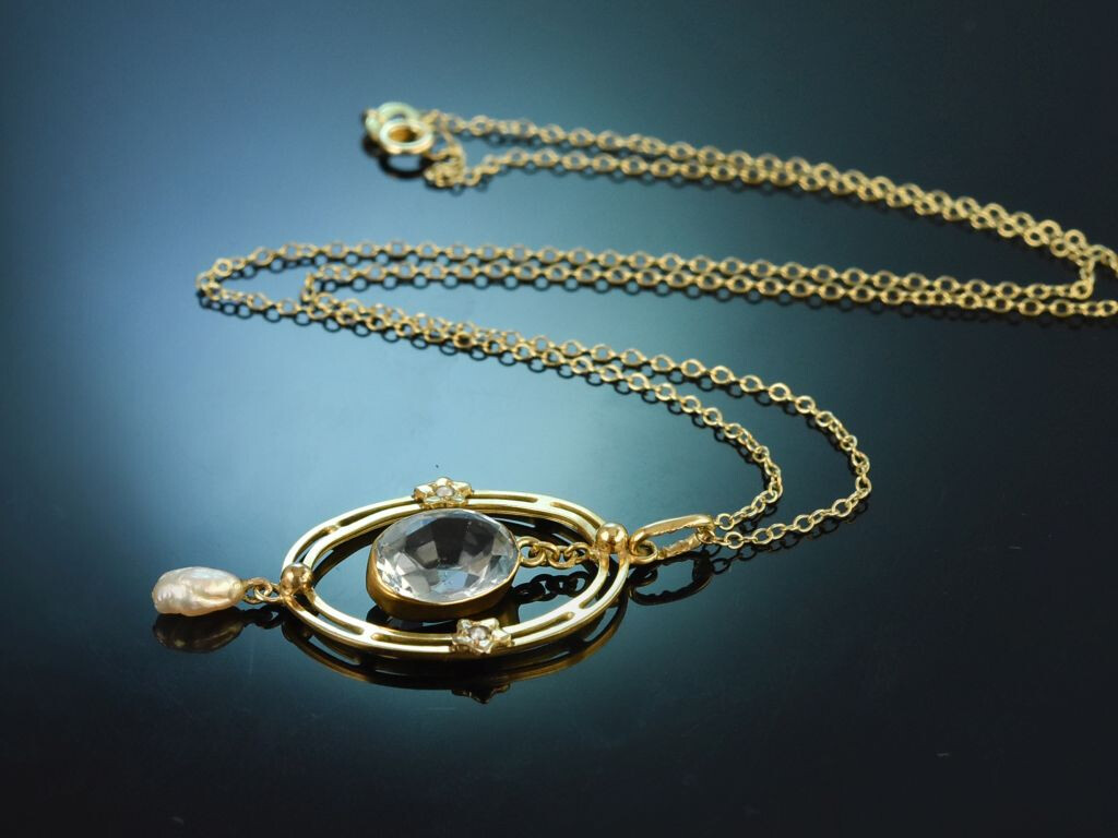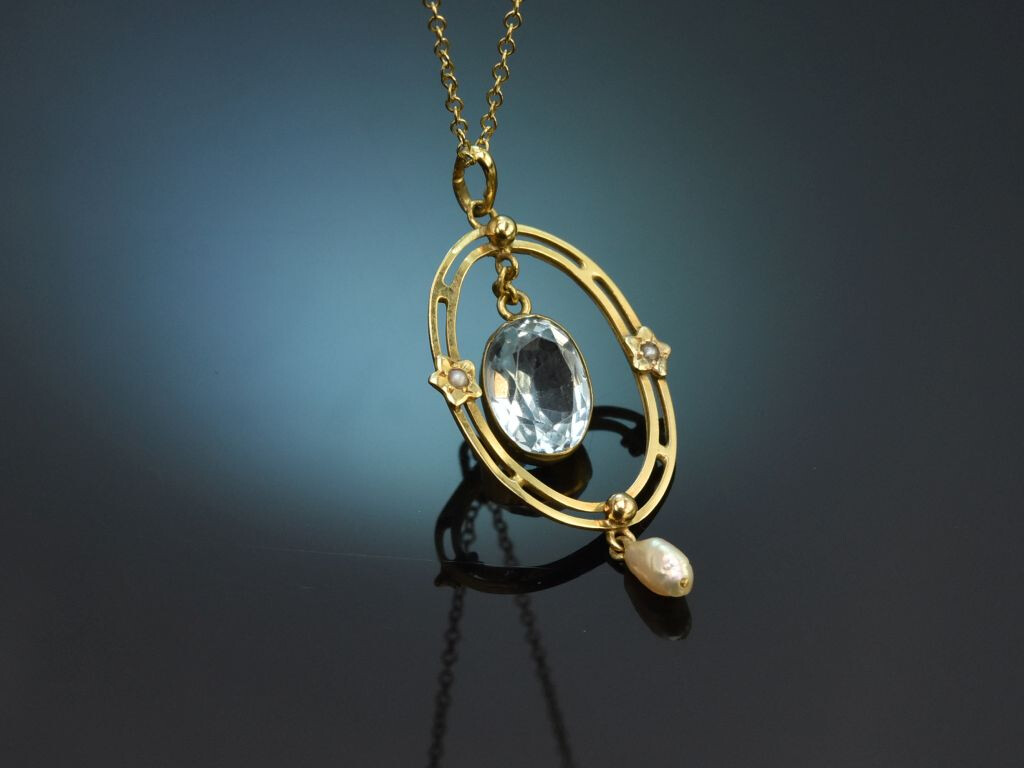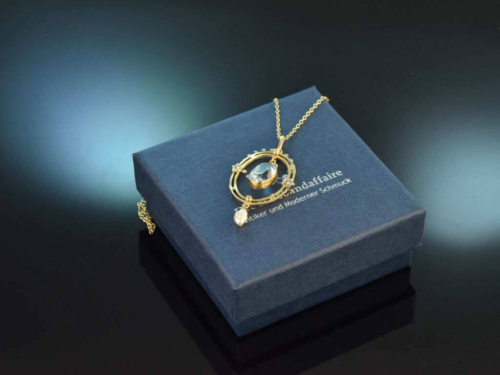 Schöner historischer Aquamarin Anhänger mit Kette, besetzt mit Saatperlen, beides gearbeitet aus Gelbgold 375 / 9 Kt (gestempelt und garantiert).