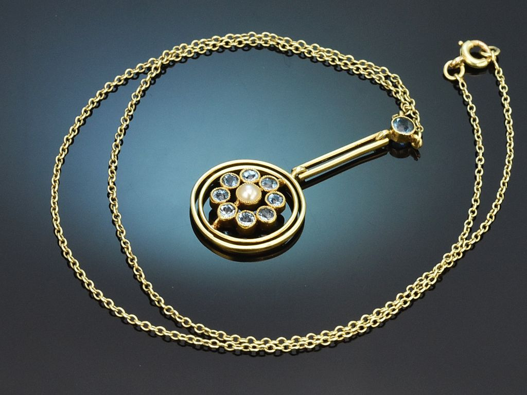 Das charmante Collier hat ein Mittelteil, dessen Spitze mit einem blau schimmernden, rund facettierten Aquamarin besetzt ist. Von diesem Stein aus verlaufen zwei elegante Stege in einen doppelt gerahmten Kreis, der den Blick harmonisch zur Mitte lenkt. Dort sitzen acht weitere Aquamarine, kreisförmig angeordnet um eine Saatperle. Die insgesamt neun Aquamarine haben zusammen ein Steingewicht von ca. 0,4 Carat und verleihen, in Harmonie mit der Saatperle, dem Schmuckstück einen feinen Glanz.