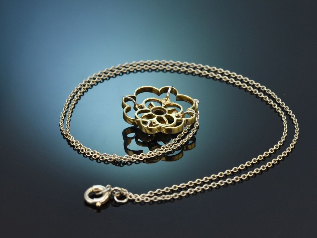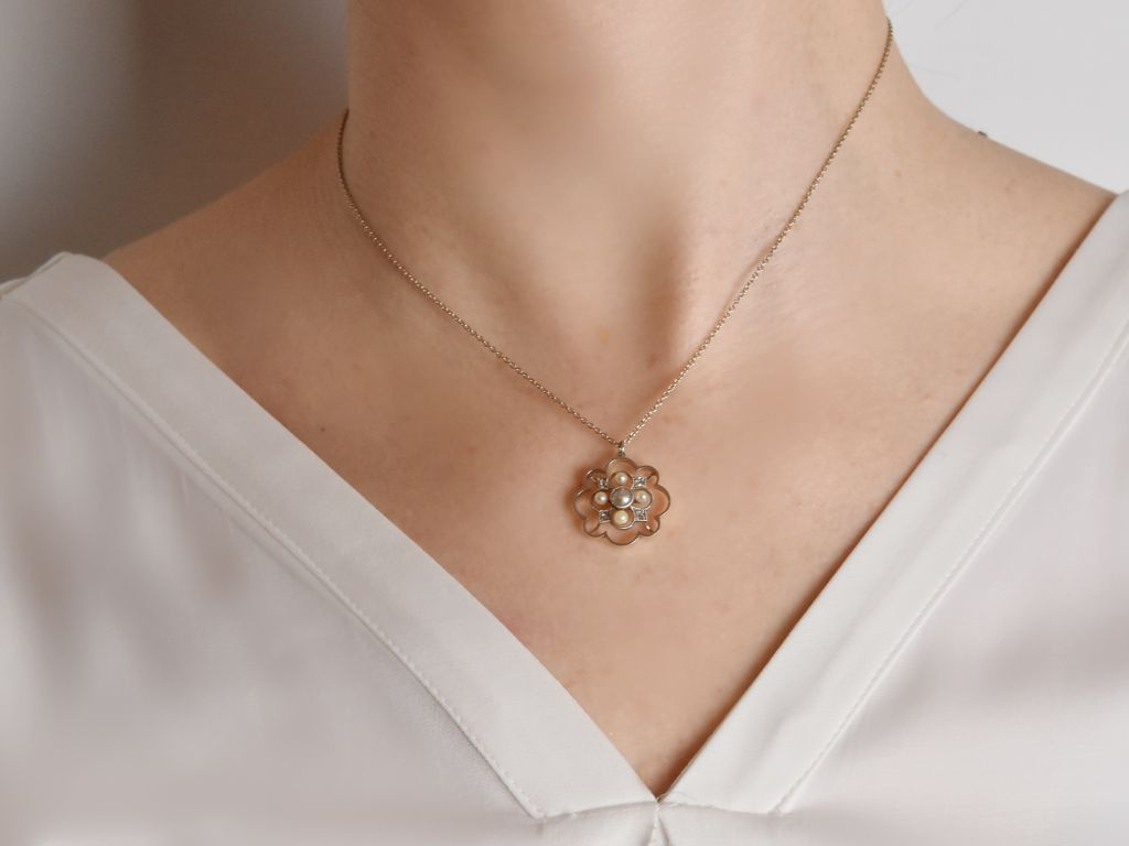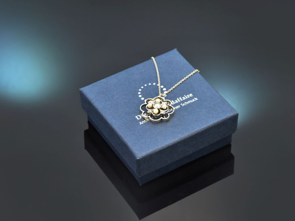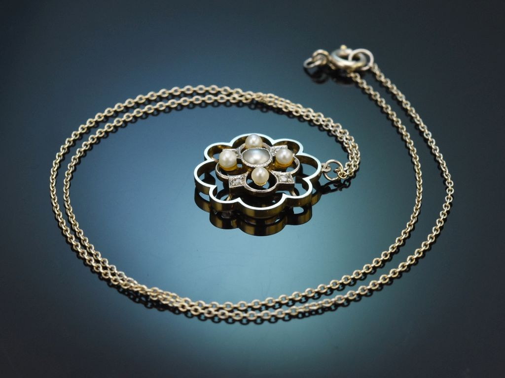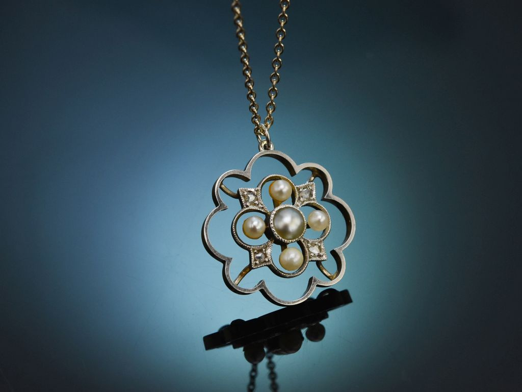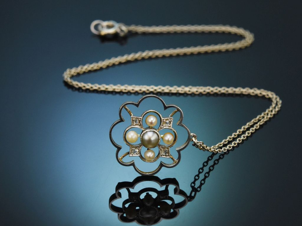 An einer feinen Ankerkette schwingt ein Anhänger mit vierpassig geschweifter Silhouette: Eine zart graue Natur-Halbperle wird gerahmt von vier weiteren, cremeweißen Saatperlen. Dazwischen sitzen vier Diamantrosen mit einem Gewicht von zus. ca. 0,12 Carat.