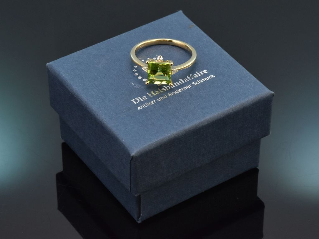 Feiner Peridot Ring mit Diamanten, gearbeitet aus Gelbgold 585/ 14 Kt (gestempelt und garantiert).