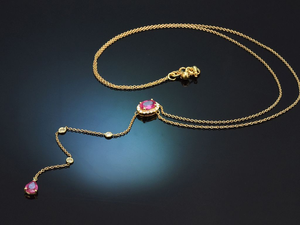 An einer feinen Ankerkette aus Gelbgold sitzt ein oval facettierter Rubin in leuchtendem Pink, kunstvoll von funkelnden Diamanten umrahmt. Von diesem Mittelstück geht eine schlanke, bewegliche Abhängung aus, besetzt mit drei weiteren Diamanten, die in einem zart funkelnden Rubintropfen endet. Die intensiv strahlenden Rubine haben zusammen ein Gewicht von 0,7 Carat, die Diamanten insgesamt 0,15 Carat (G–H, SI1–SI2).