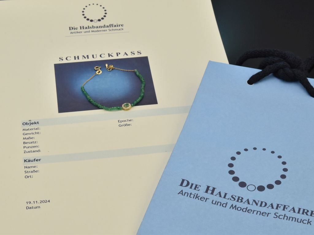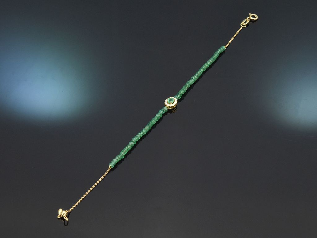 Das feine Armband besteht aus einem ovalen Mittelstück mit einem schönen Smaragd in Ovalschliff, der von zwölf qualitätvollen Diamanten in Brillantschliff von zus. 0,10 Carat (G-H/ SI1-SI2) umrahmt wird. Das funkelnde Mittelmotiv wird an beiden Seiten von je einer Reihe rund facettierter Smaragde geziert, die wiederum in Goldkettchen münden.