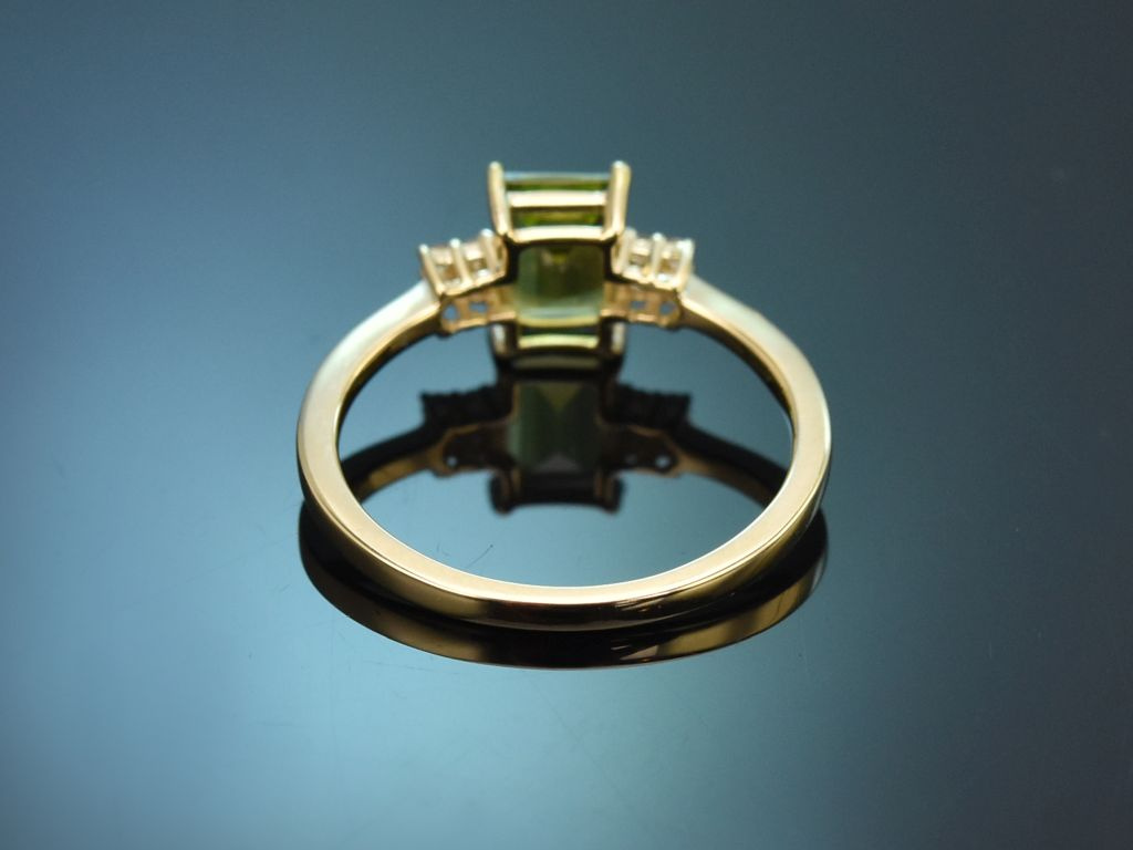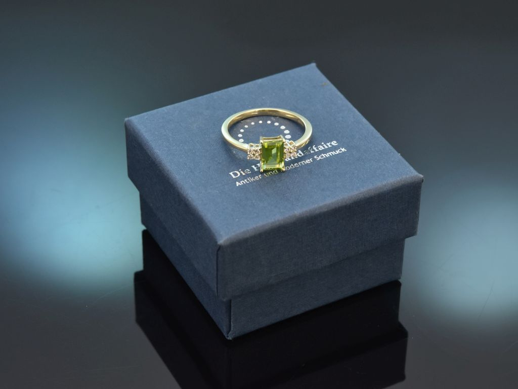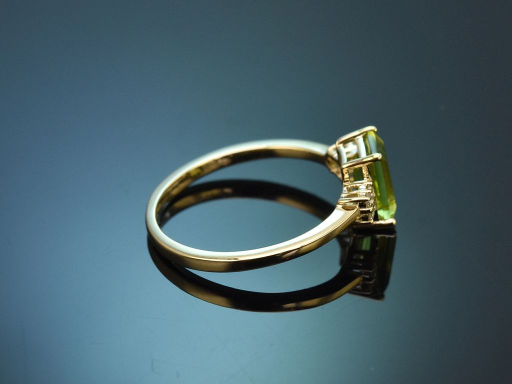 Schöner Peridot Ring mit Diamanten, gearbeitet aus Gelbgold 585 / 14 Kt (gestempelt und garantiert).