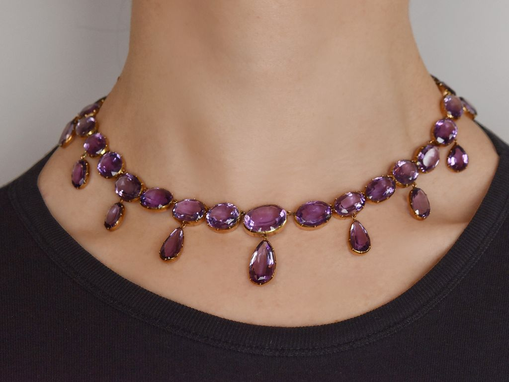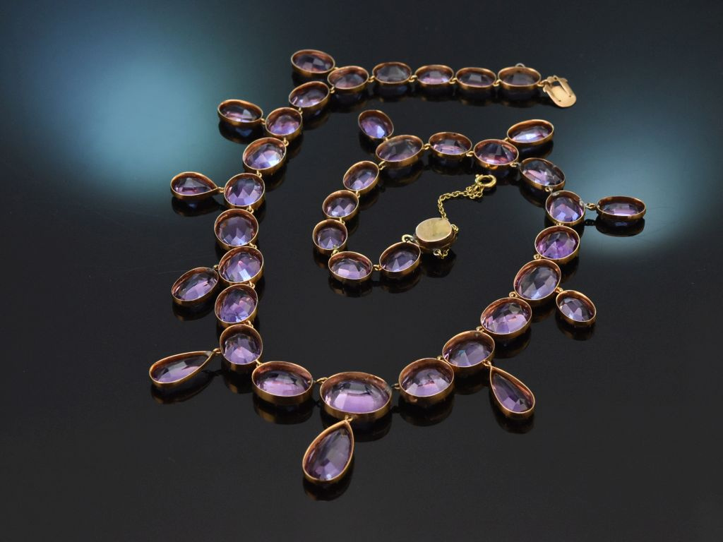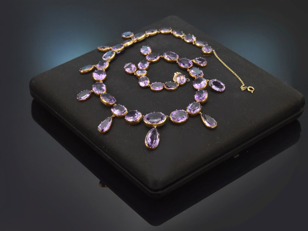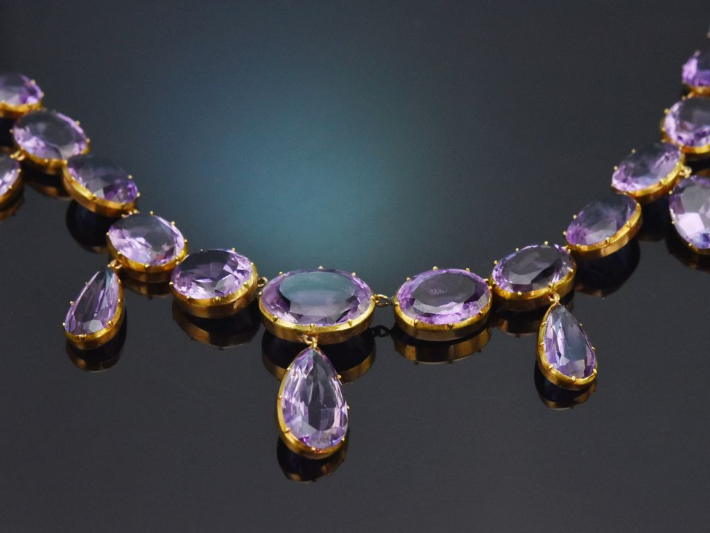 Das exquiste antike Schmuckstück besteht aus einer Reihe oval facettierter Amethyste, die im Verlauf angeordnet sind und mittig von elf Abhängungen ergänzt werden. Diese Abhängungen, beweglich angehangen durch kleine Ösen, sind ebenfalls mit ovalen bzw. tropfenförmigen Amethysten in wundervollem Violett besetzt.