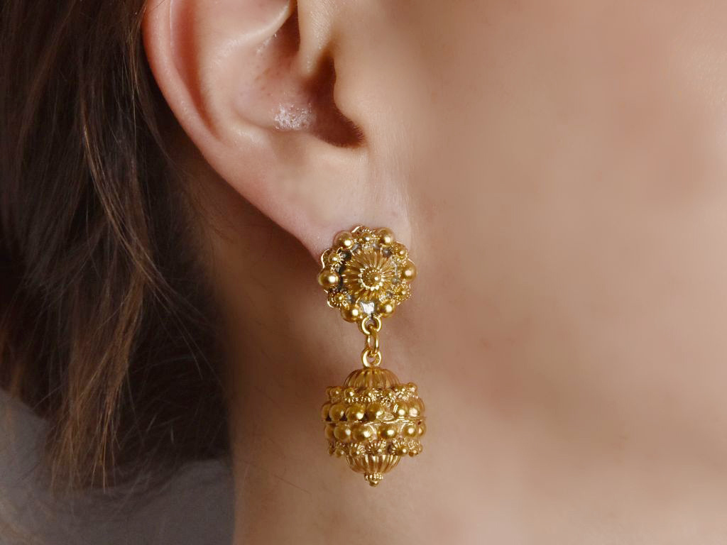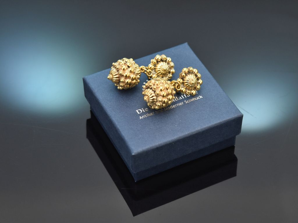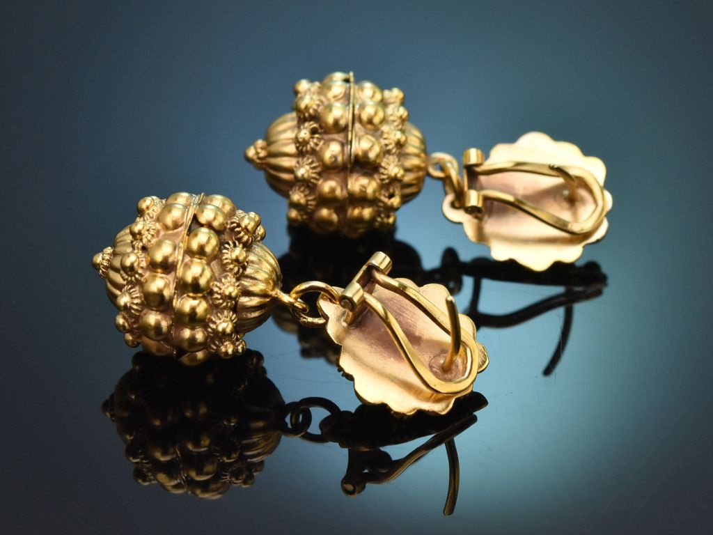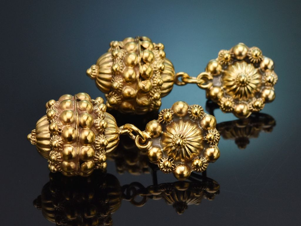 Der obere Teil der opulent verzierten Ohrringe besteht aus einer geriffelten Kuppel, die von fein strukturierten, aufgesetzten Kügelchen umgeben wird. Daran hängt jeweils eine freischwingende Kugel, die sich aus einem umlaufenden Band aus Kügelchen und kleinen Blütenmotiven und zwei ebenfalls gerillten Kuppeln zusammensetzt.