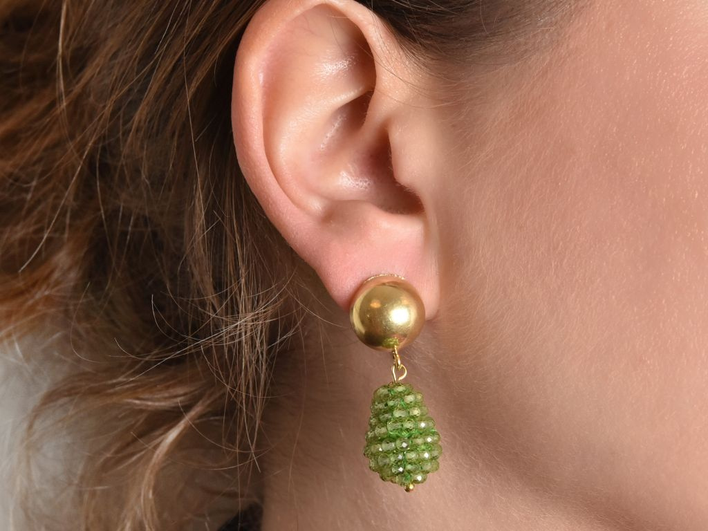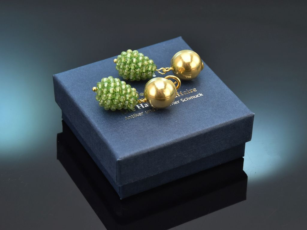 An halbkugeligen vergoldeten Brisuren schwingt je ein gefädelter Tropfen aus schönem, grünen Peridot. Die praktischen Omega-Brisuren erleichtern das An- und Ablegen des Ohrschmuckes und bieten einen sehr guten Halt am Ohr.