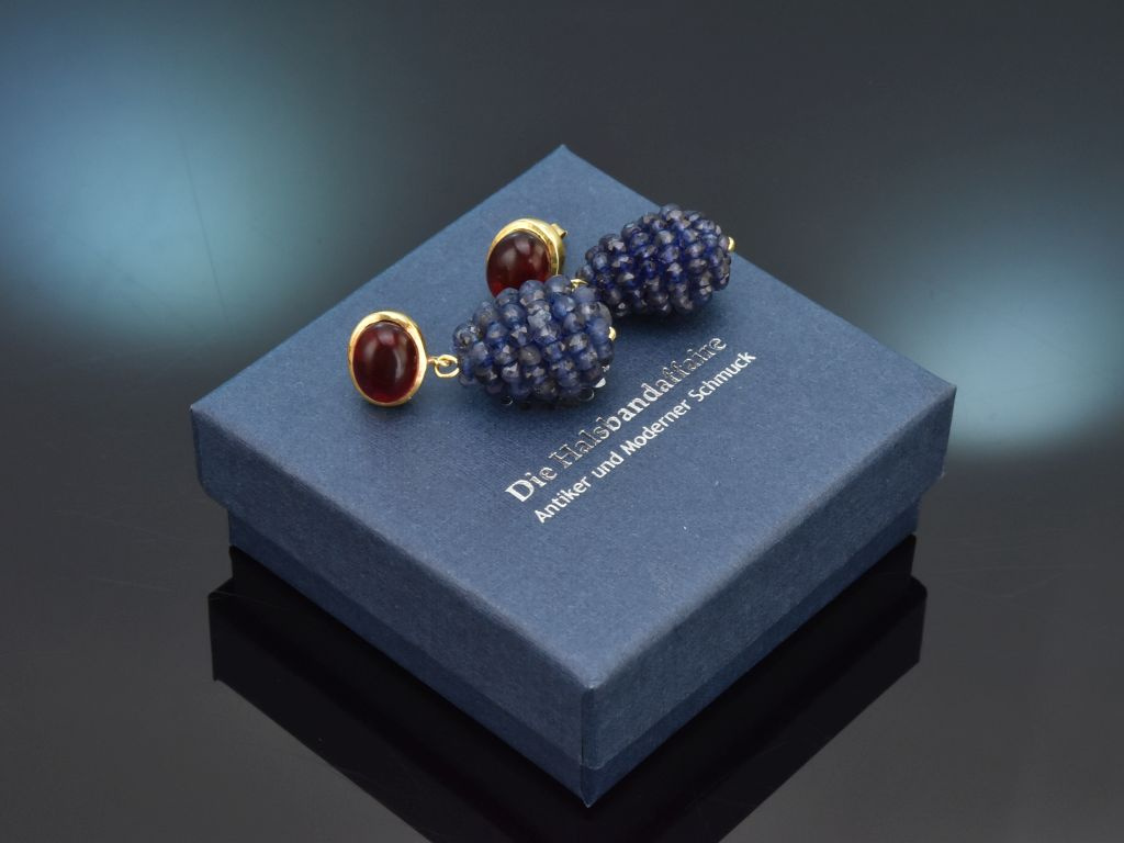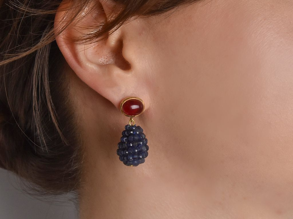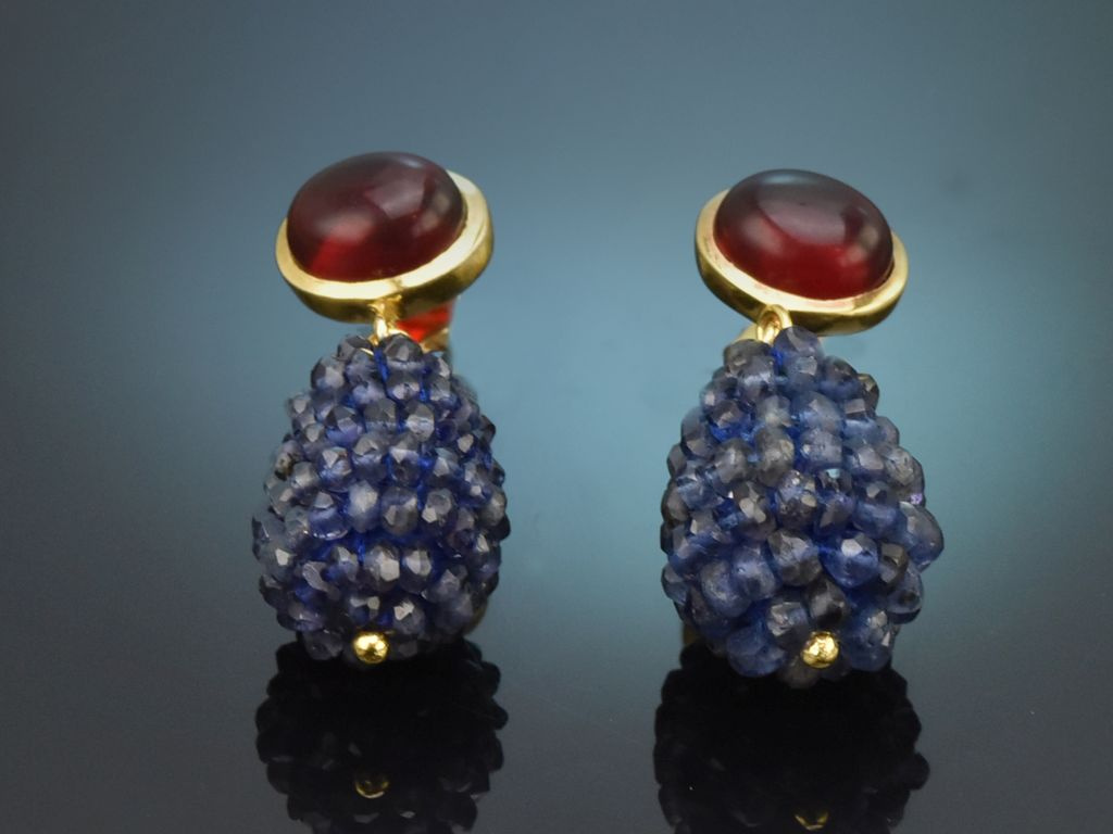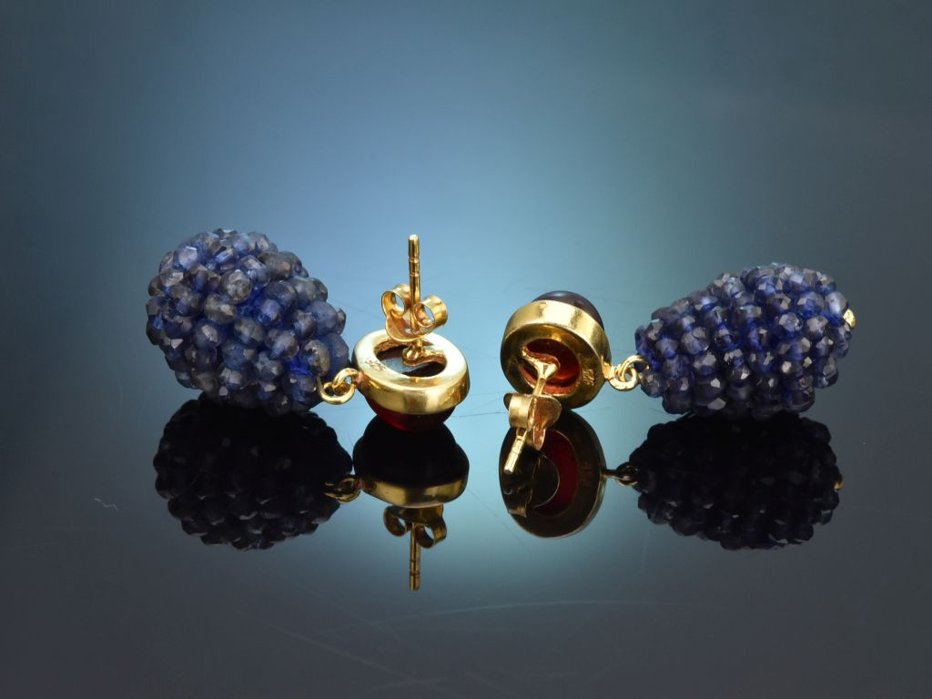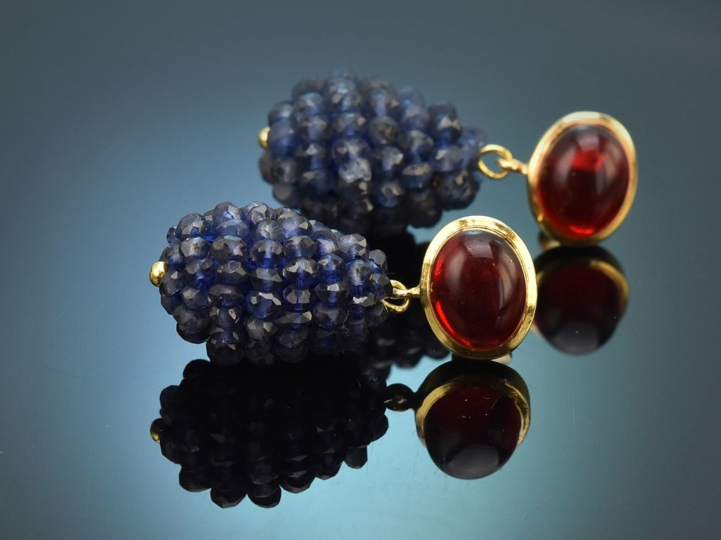 An ovalen Steckbrisuren besetzt mit roten Achatcabochons schwingt je ein Tropfen aus gefädelten, facettierten Iolithkügelchen in sattem dunklen Blau. Praktische Butterflyverschlüsse sorgen dafür, dass der Ohrschmuck angenehm und dennoch sicher am Ohr sitzt.