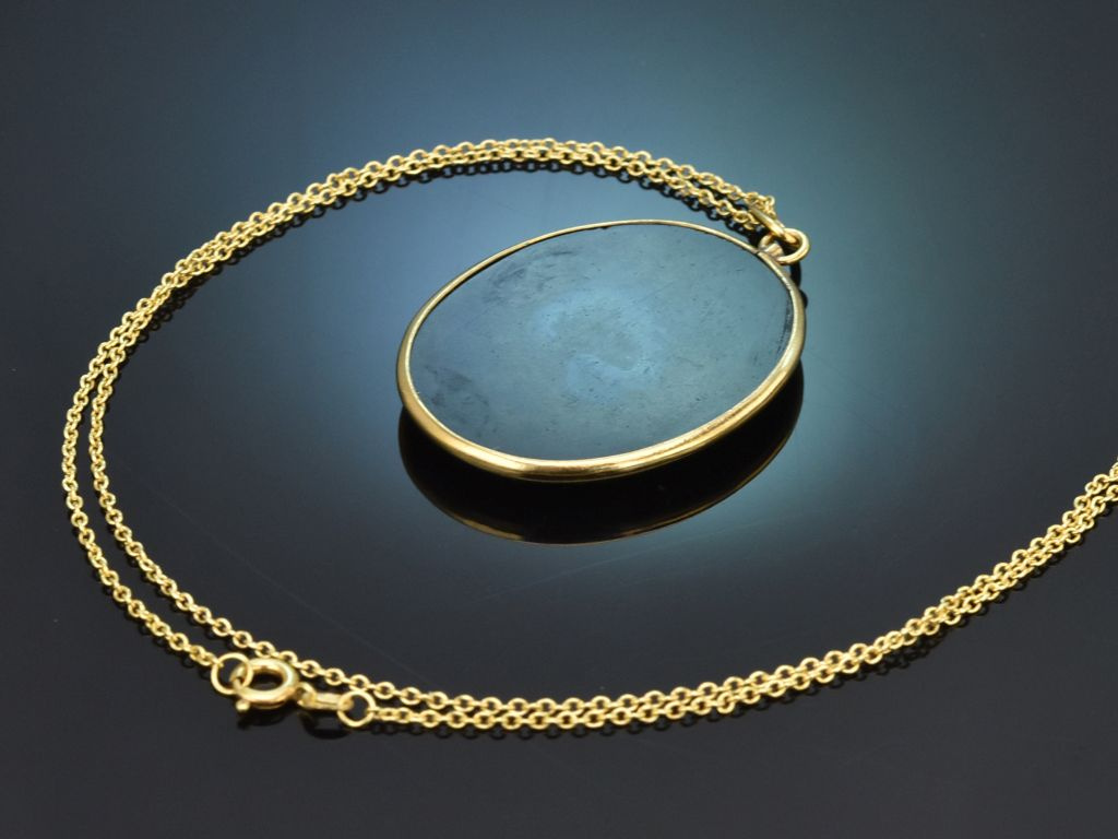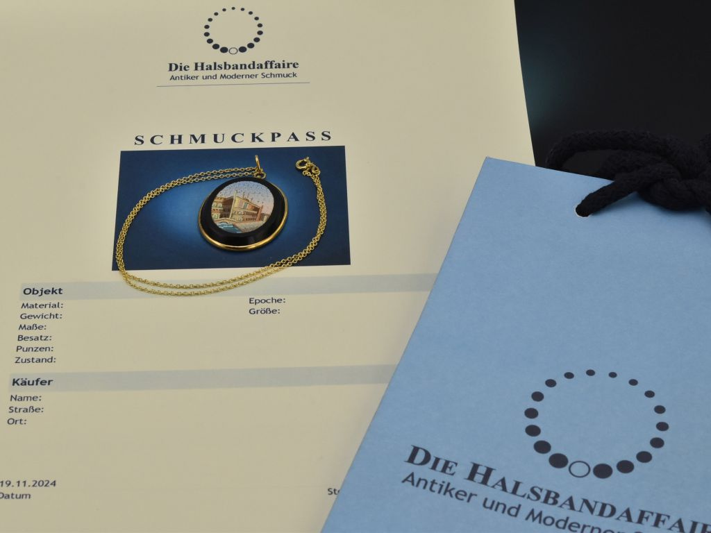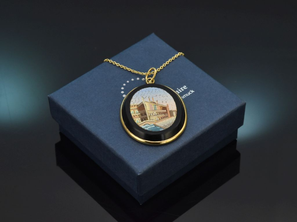 An einer Ankerkette hängt ein hochovaler Anhänger, in dessen vergoldeter Zargenfassung eine schwarz glänzende Onyxscheibe sitzt. Darin ist ein feines polychromes Mikromosaik gearbeitet, das eine Stadtansicht von Venedig mit einem Stück des berühmten Canale Grande zeigt.