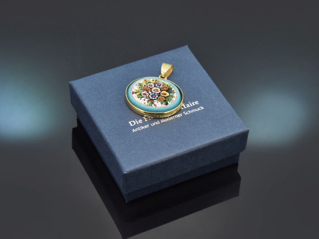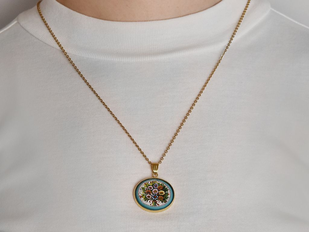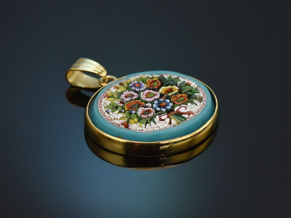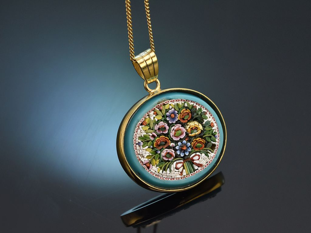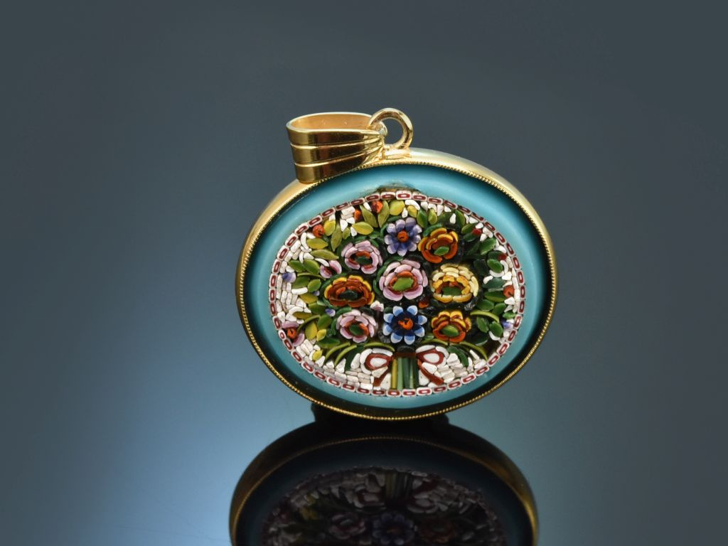 Der querovale Anhänger ist mit einem hübschen polychromen Mikromosaik versehen, das ein üppiges Blumenbouquet darstellt. Die detailreichen Blüten und Blätter des Mosaiks sind in vielen perfekt aufeinander abgestimmten Farbschattierungen gestaltet und auf einem türkisfarbenen Untergrund aus Glasfluss aufgebracht, der eine passende Umrahmung für das schöne Motiv gibt.