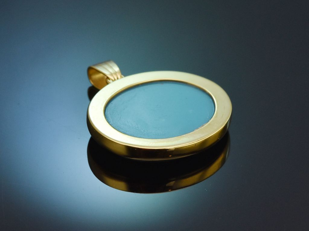 Durch die große Anhängeröse lassen sich Ketten unterschiedlicher Stärken anbringen. Das Mikromosaik entstand um 1890, die schlichte vergoldete Rahmung aus Silber wurde in der Mitte des 20. Jahrhunderts ergänzt.