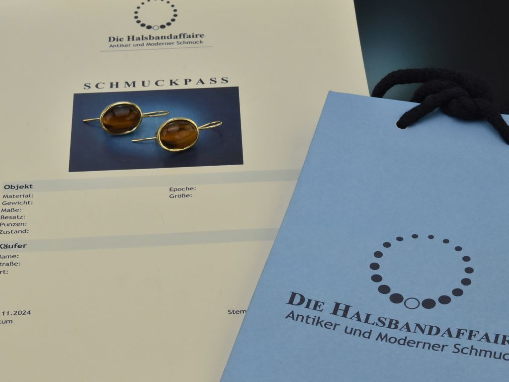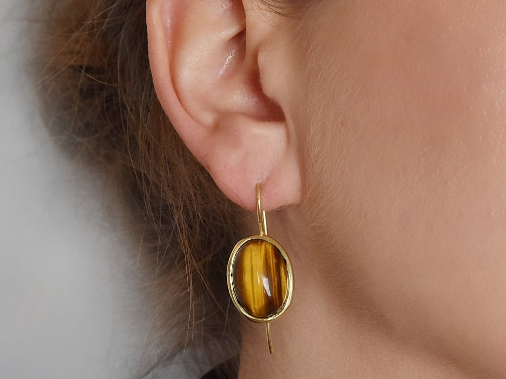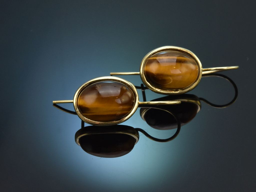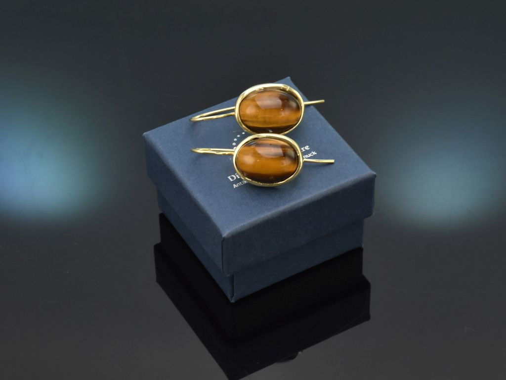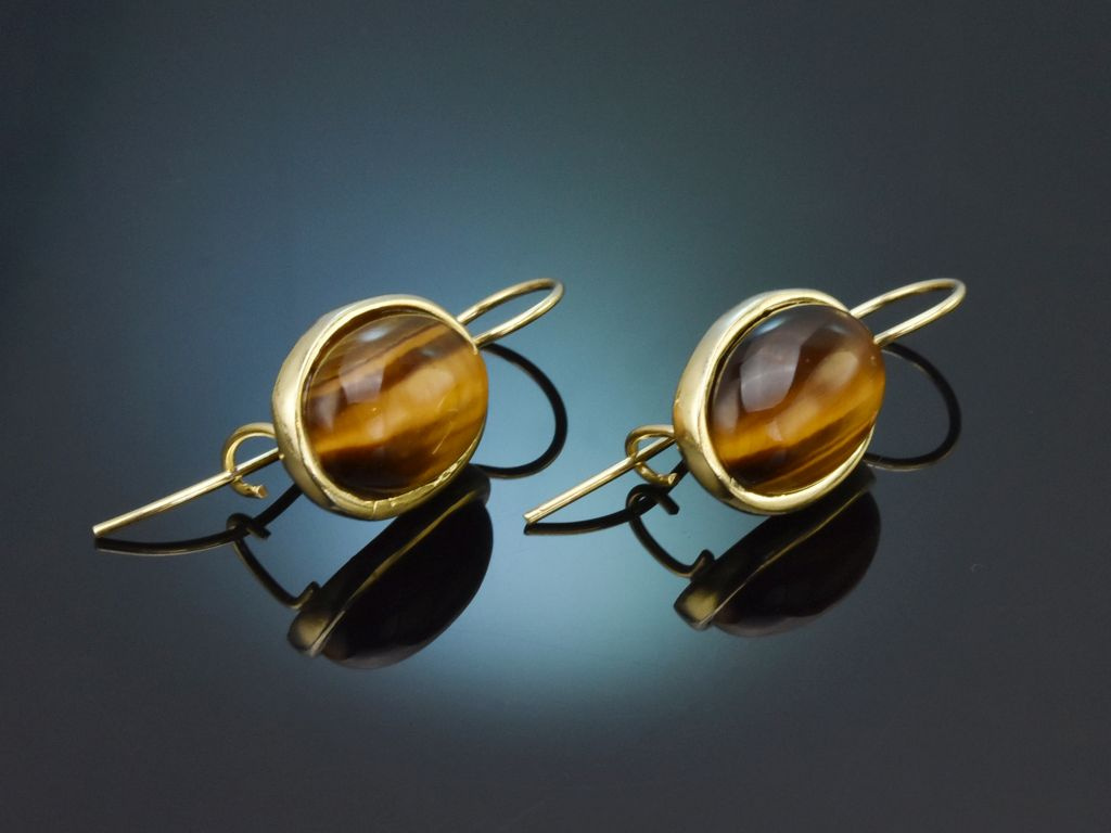 An großen Hakenbrisuren aus vergoldetem Sterlingsilber sitzt jeweils ein ovales Tigerauge in Cabochonschliff mit der charakteristischen Chatoyance, auch als Katzenaugeneffekt bekannt. Bei Beleuchtung mit einer punktförmigen Lichtquelle sieht man einen hellen Lichtstreifen, der senkrecht zu den Fasern verläuft und bei Bewegung des Steins über dessen Oberfläche wandert.