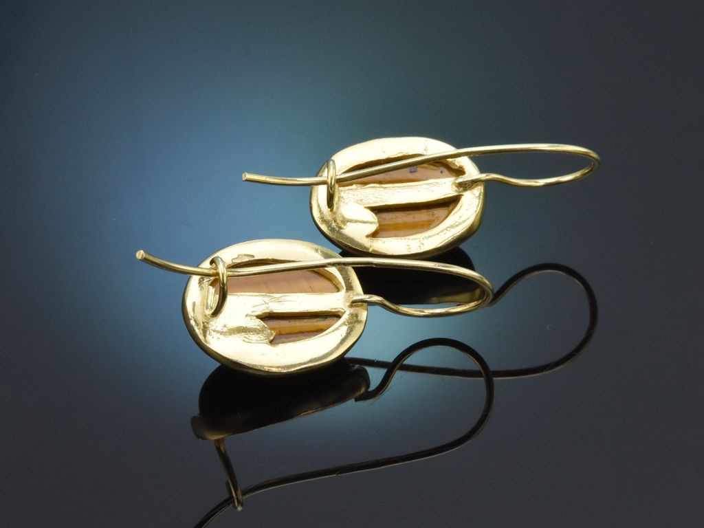 Der warme Goldton der Fassung und der Brisuren passt hervorragend zu den schimmernden Brauntönen der interessanten Edelsteinen. Die hübschen Ohrringe aus Italien sind echte Lieblingsstücke und lassen sich vielseitig kombinieren.
