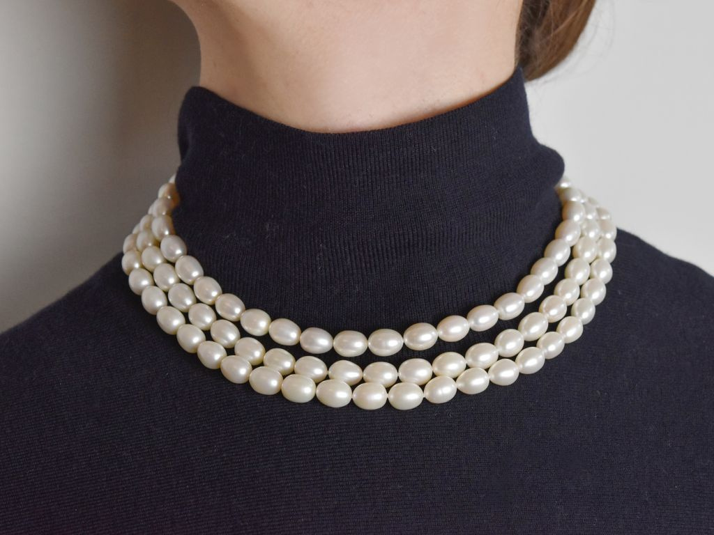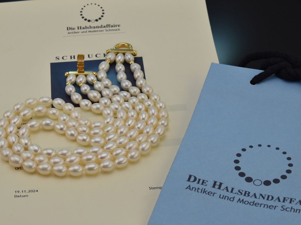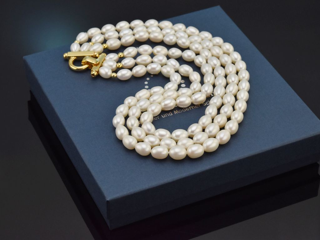 Die olivenförmigen Perlen der schönen dreireihigen Kette bestechen durch ihren gleichmäßig schimmernden, weißen Lüster. Die Kette legt sich elegant im Stile Jackie Kennedys um den Hals. Zwei kleine Zierelemente aus vergoldetem Silber, jeweils an beiden Enden der Stränge, greifen den Goldton der Schließe auf und runden das Design der Kette harmonisch ab.