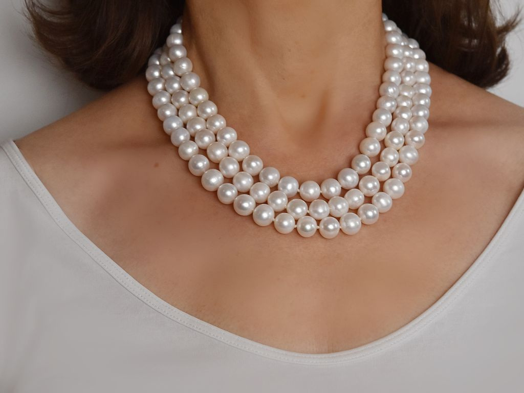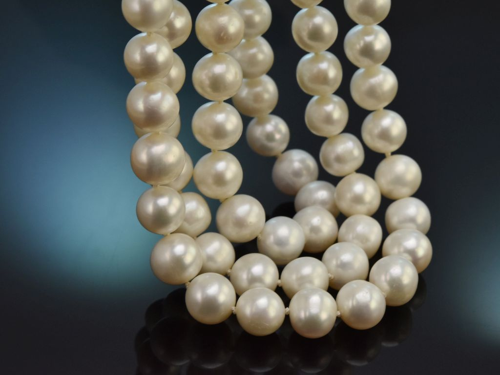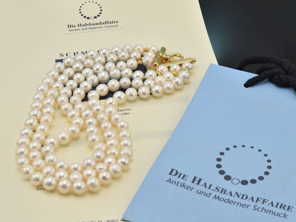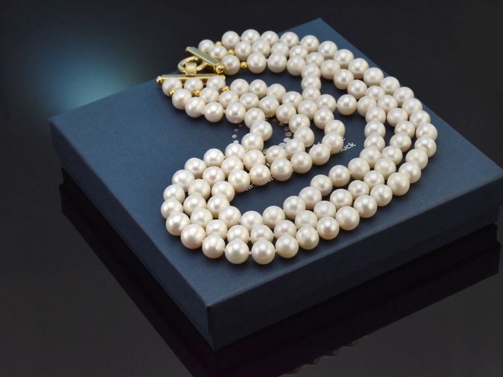 Die großen Perlen der schönen dreireihigen Kette bestechen durch ihren gleichmäßig schimmernden, weißen Lüster. Die Kette legt sich elegant im Stile Jackie Kennedys um den Hals. Zwei kleine Zierelemente aus vergoldetem Silber, jeweils an beiden Enden der Stränge, greifen den Farbton der Schließe auf und runden das Design der Kette harmonisch ab.