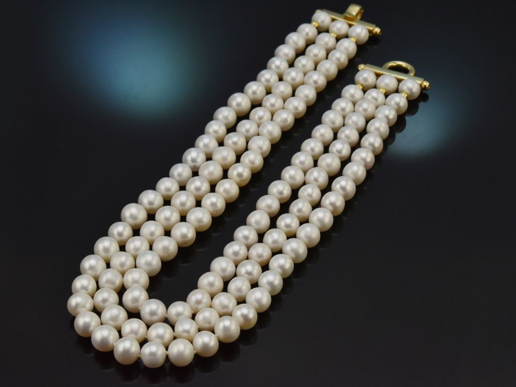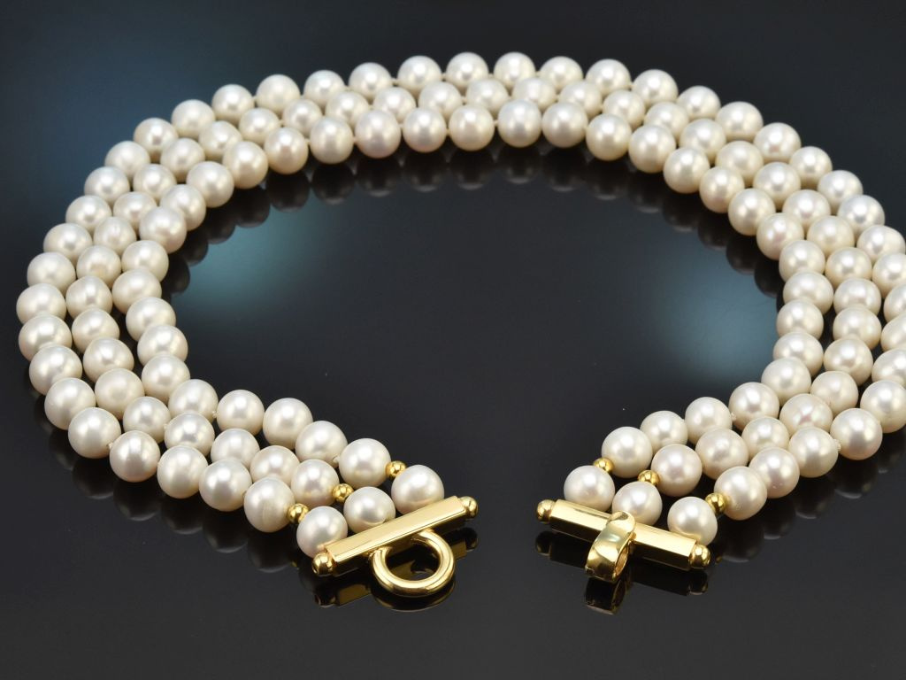 Edle dreireihige Süßwasser Zuchtperlenkette mit einer Schließe aus vergoldetem Sterlingsilber (gestempelt und garantiert).