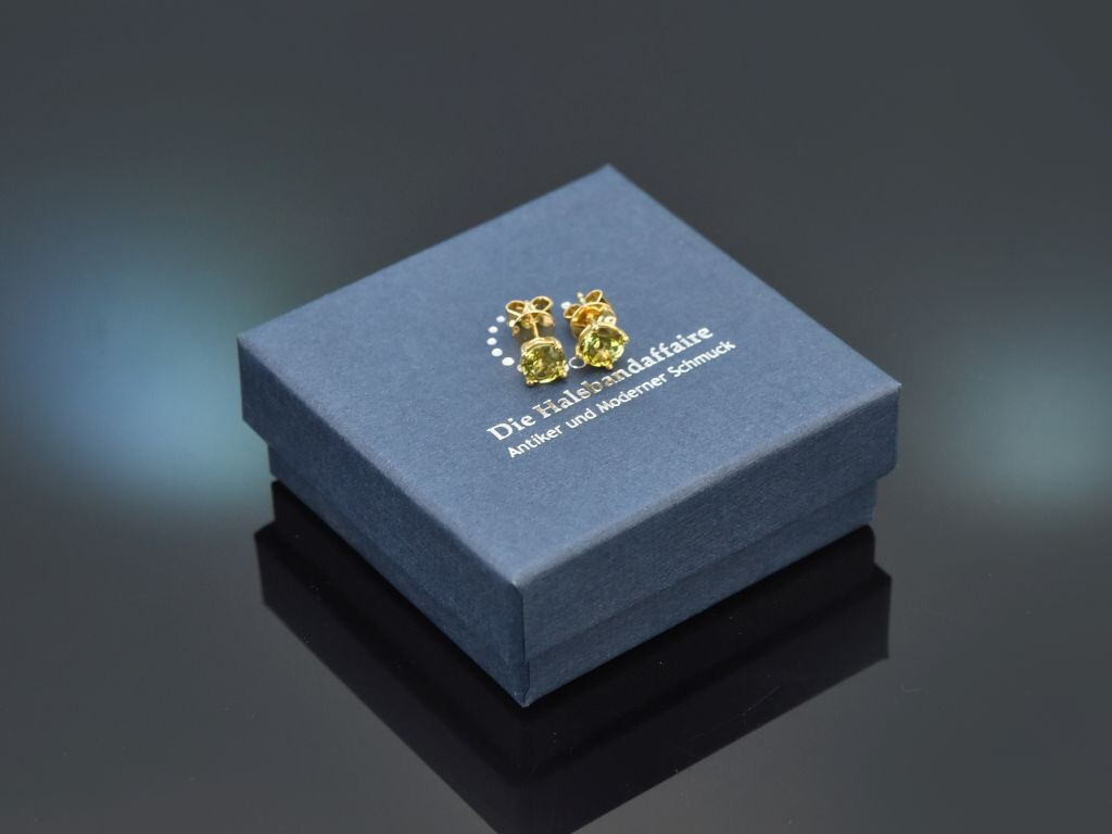 Die feinen Ohrringe sind mit jeweils einem intensiv hellgrünen Turmalin in rundem Facettenschliff besetzt. Die Farbsteine sitzen in Krappenfassungen und haben ein Steingewicht von zus. 1,96 Carat.