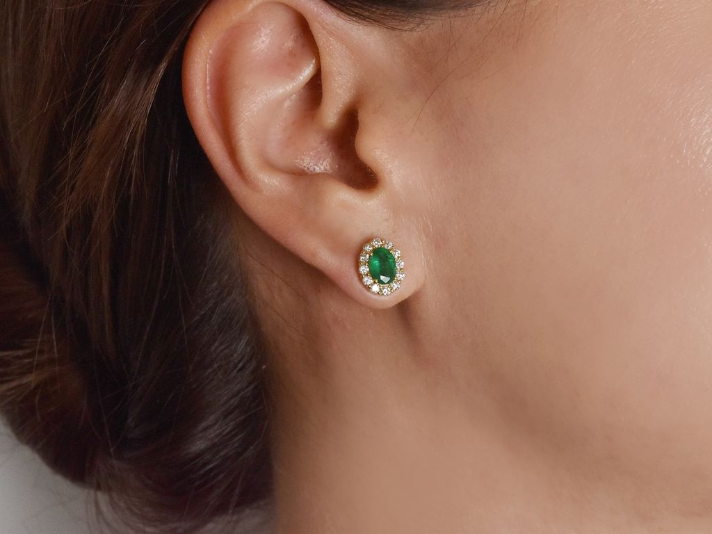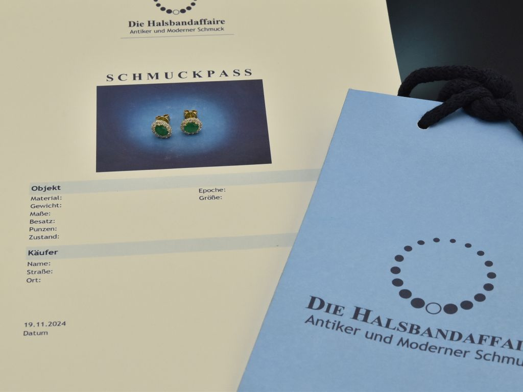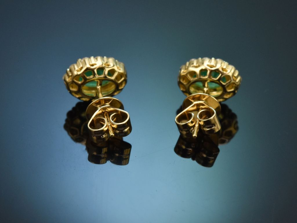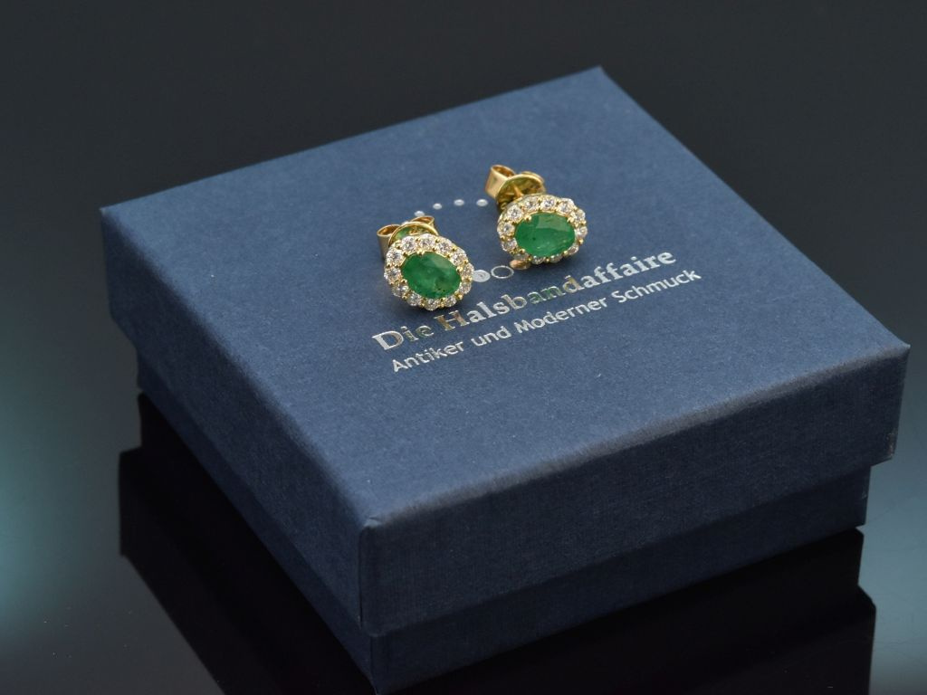 Der edle Ohrschmuck ist mittig mit je einem leuchtend grünen, oval facettierten Smaragd besetzt. Die schönen Farbsteine haben ein Steingewicht von zusammen 1,16 Carat. Sie werden gerahmt von je zwölf Diamanten in Brillantschliff, mit einem Steingewicht von zus. ca. 0,56 Carat. Sie liegen im schönen Qualitätsbereich (G-H, SI1-SI2).