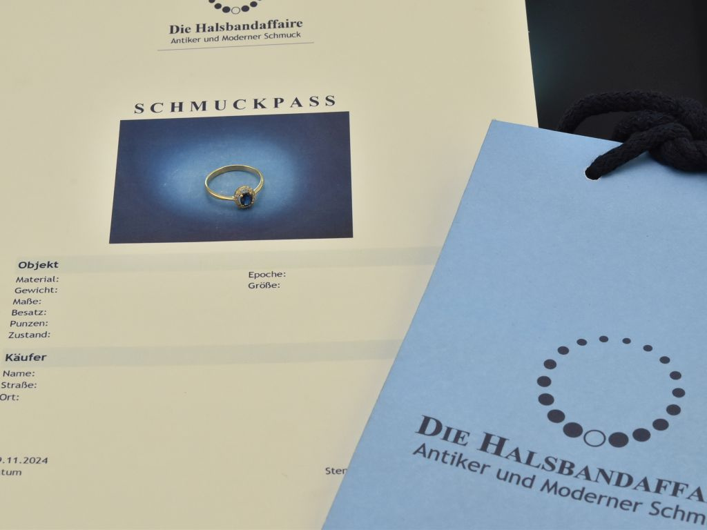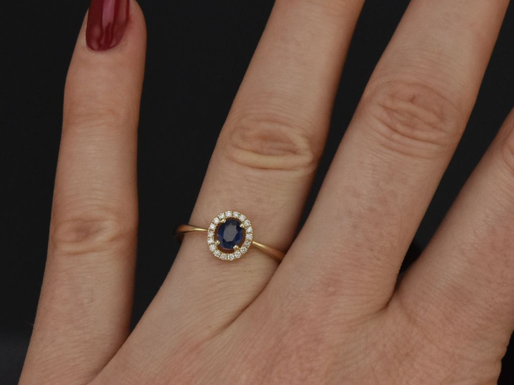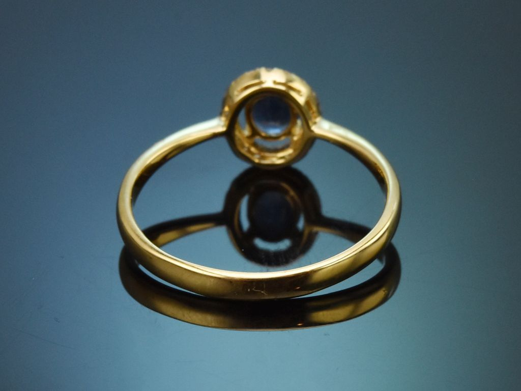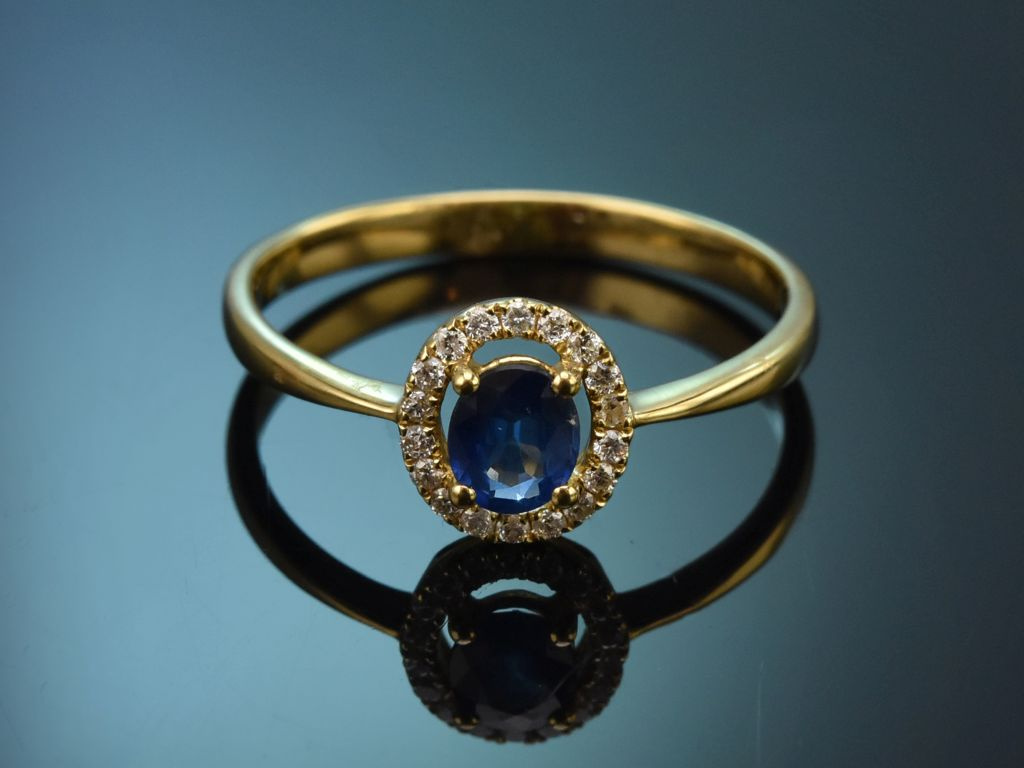 Der ovale Ringkopf ist mittig mit einem oval facettierten Saphir von 0,30 Carat besetzt. Gerahmt wird der schöne, leuchtend blaue Edelstein von einem Kranz aus insgesamt 18 Diamanten in Brillantschliff mit einem Steingewicht von zus. 0,10 Carat. Die Brillanten liegen allesamt im schönen Qualitätsbereich (G-H, SI1-SI2).