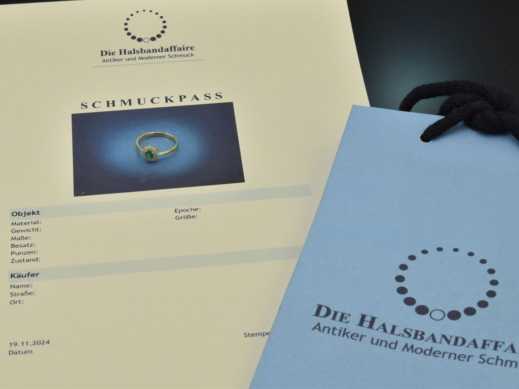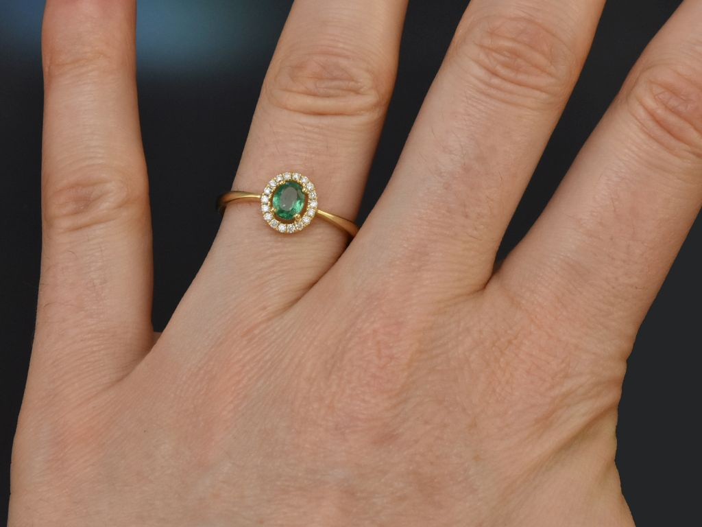 Der Ringkopf ist mit einem oval facettierten, leuchtend grünen Smaragd von 0,30 Carat besetzt, der von 18 funkelnden Brillanten umrahmt wird. Die Brillanten haben ein Steingewicht von zusammen 0,1 Carat und liegen im schönen Qualitätsbereich (G-H, SI1-SI2).