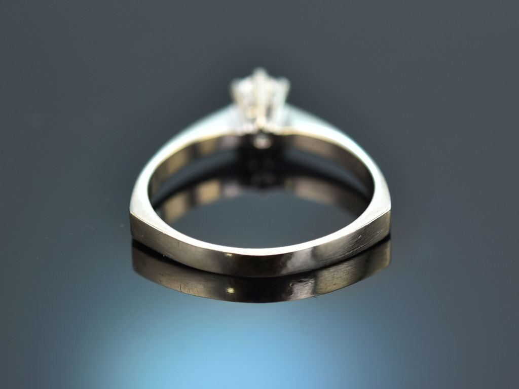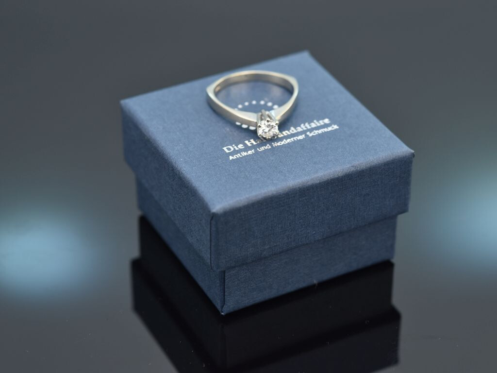 Der zeitlose Ring ist besetzt mit einem hinreißenden Diamant in Brillantschliff von ca. 0,3 Carat. Der funkelnde Edelstein sitzt in einer schlichten Krappenfassung und befindet sich im sehr schönen Farb- und Reinheitsbereich (G-H, VS1).